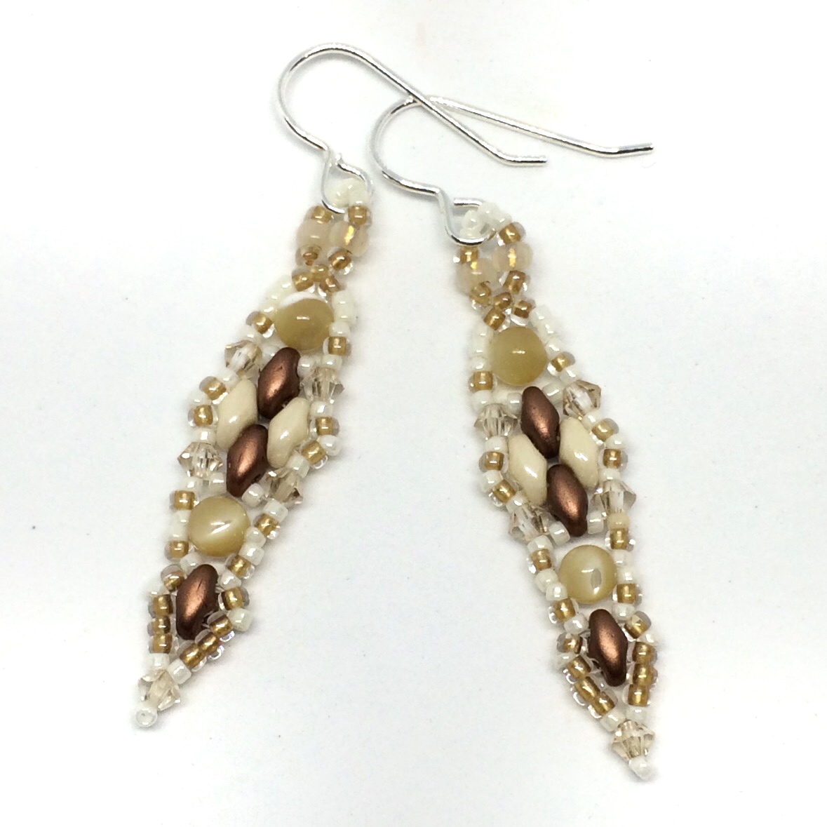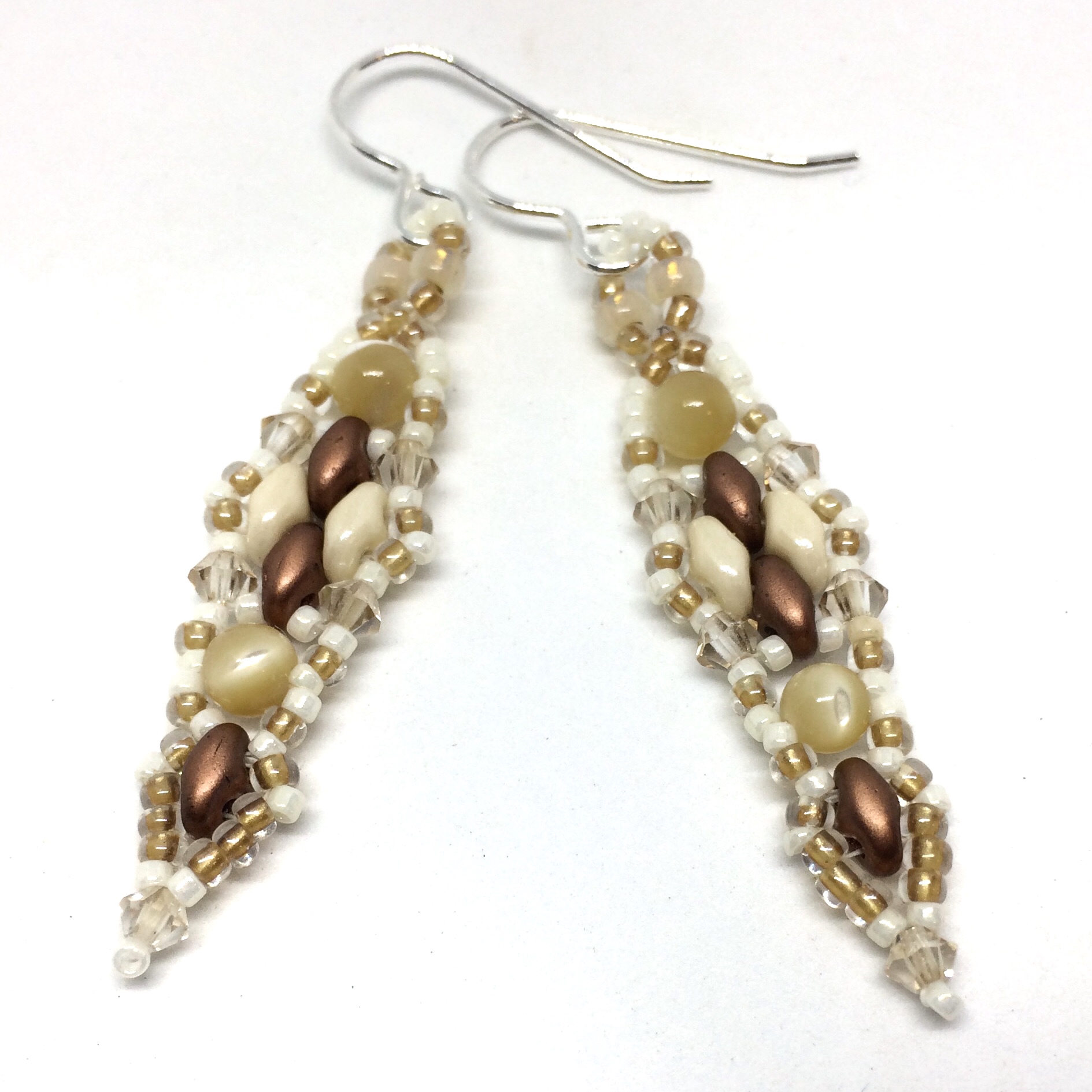 Fresh and feminine, natural mother-of-pearl looks lovely any time of year and for all occasions. These earrings feature brushed copper color center beads, creamy natural mother-of-pearl beads, and pale gold crystals.