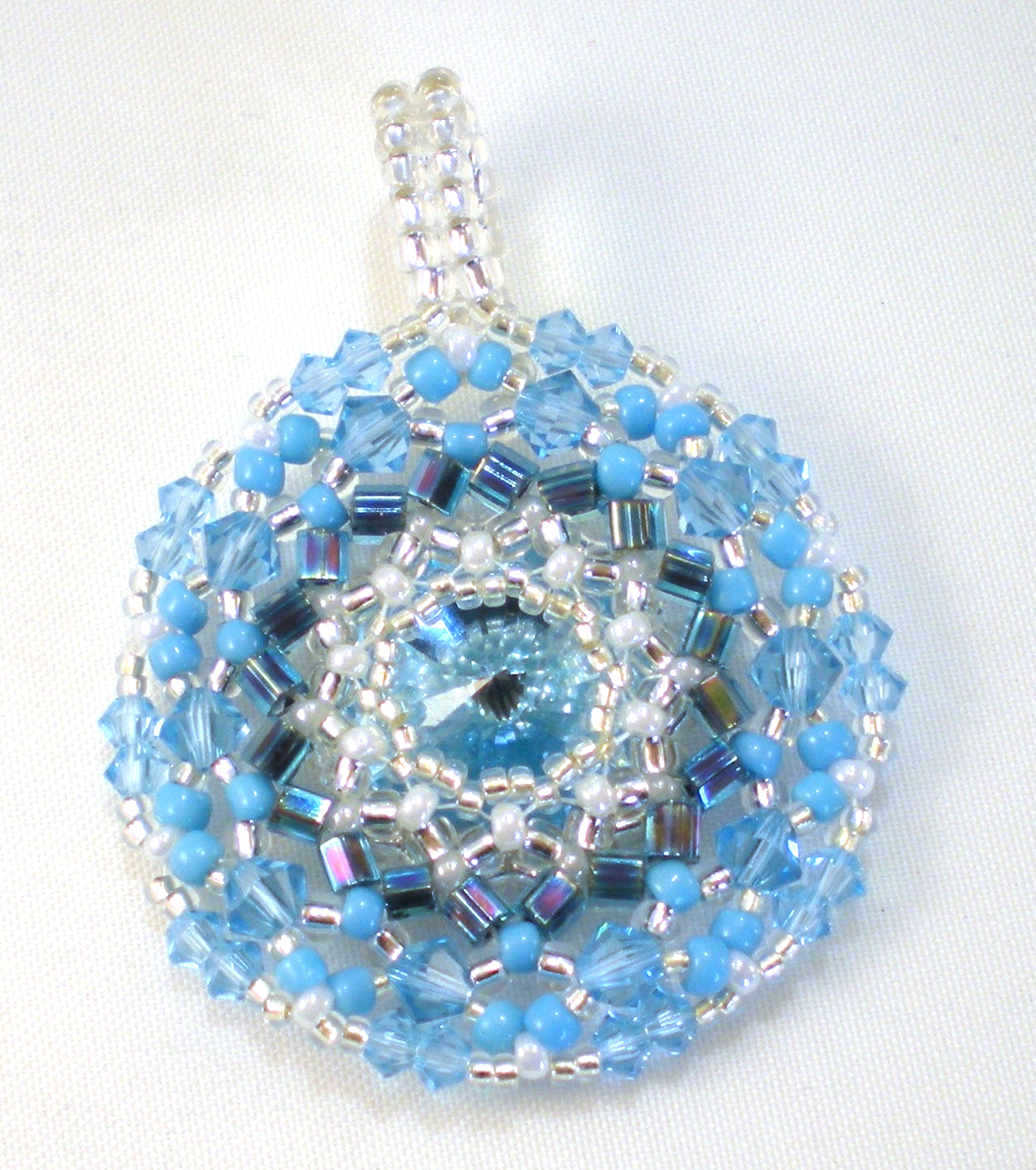 This sparkling pendant is loaded with aquamarine color Swarovski crystals, including the center crystal. I chose a Mandela circular pattern and wove the crystals and glass beads in white, silver, aqua, and dark blue. The loop is large enough to fit on almost any chain, hoop, or ribbon.