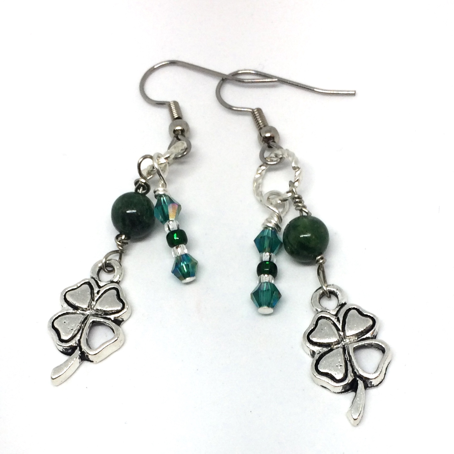 Need to add a little St. Patrick's Day spirit into your outfit? These earrings feature a natural green stone and emerald color crystals. Shamrock charm is pewter.