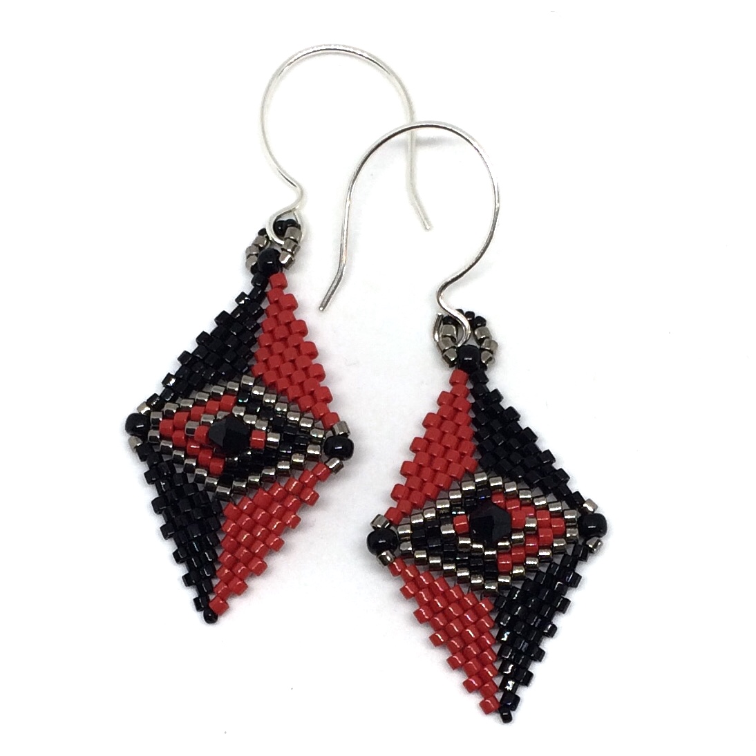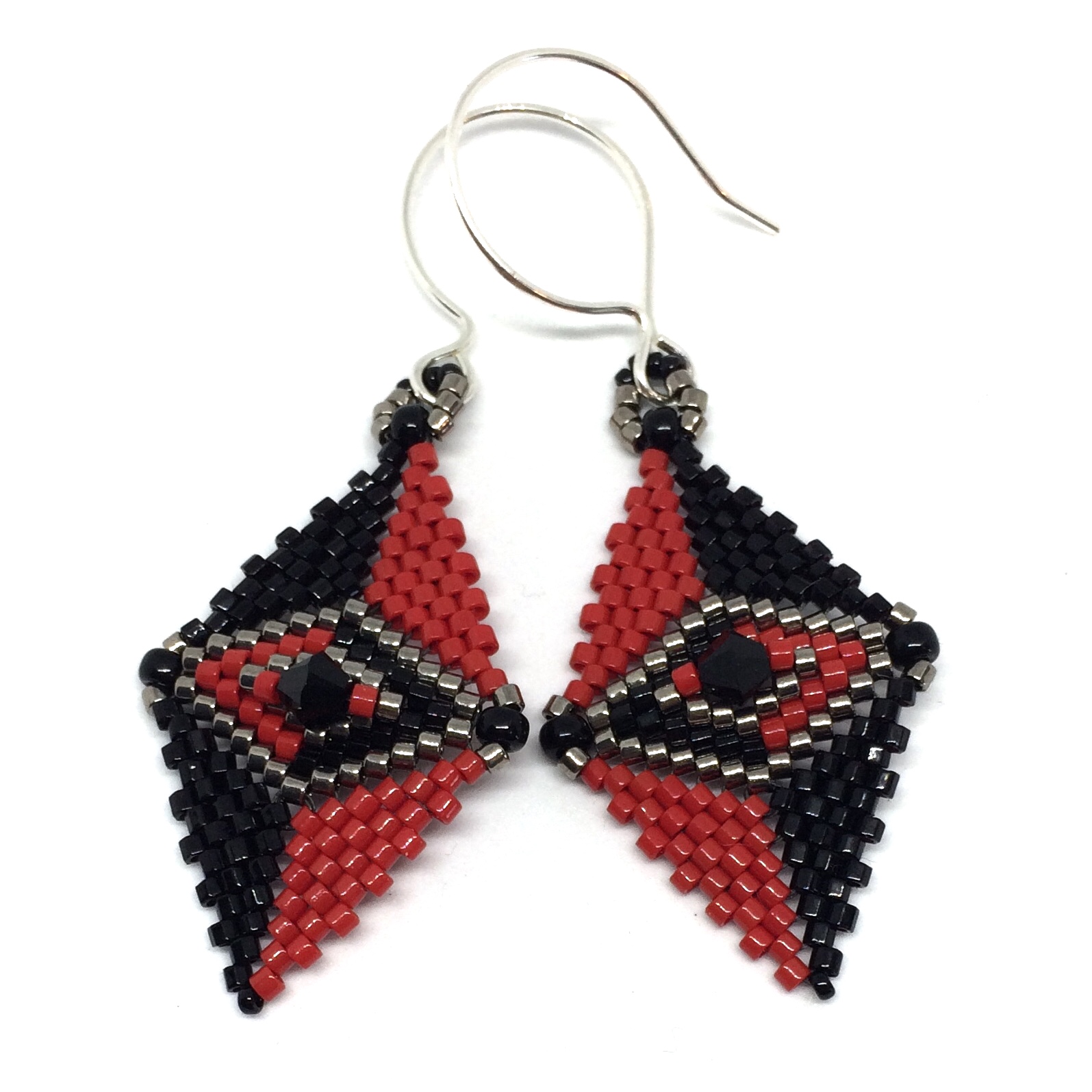 I wove over one hundred beads of red and black glass together with silver accents and a single black crystal in the center for each earring. The diamond shape hangs down from top of hook 2.25 inches.The diamond shape is made up of four triangles and has an Egyptian look to it.