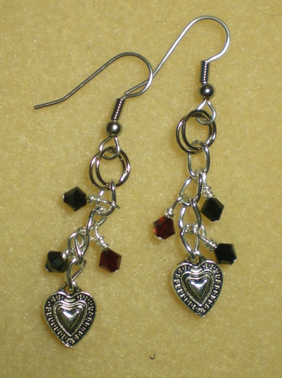 I made these earrings with Swarovski crystals, two black and one deep red, and a pewter heart charm hanging from chain. Ear hooks are surgical steel.