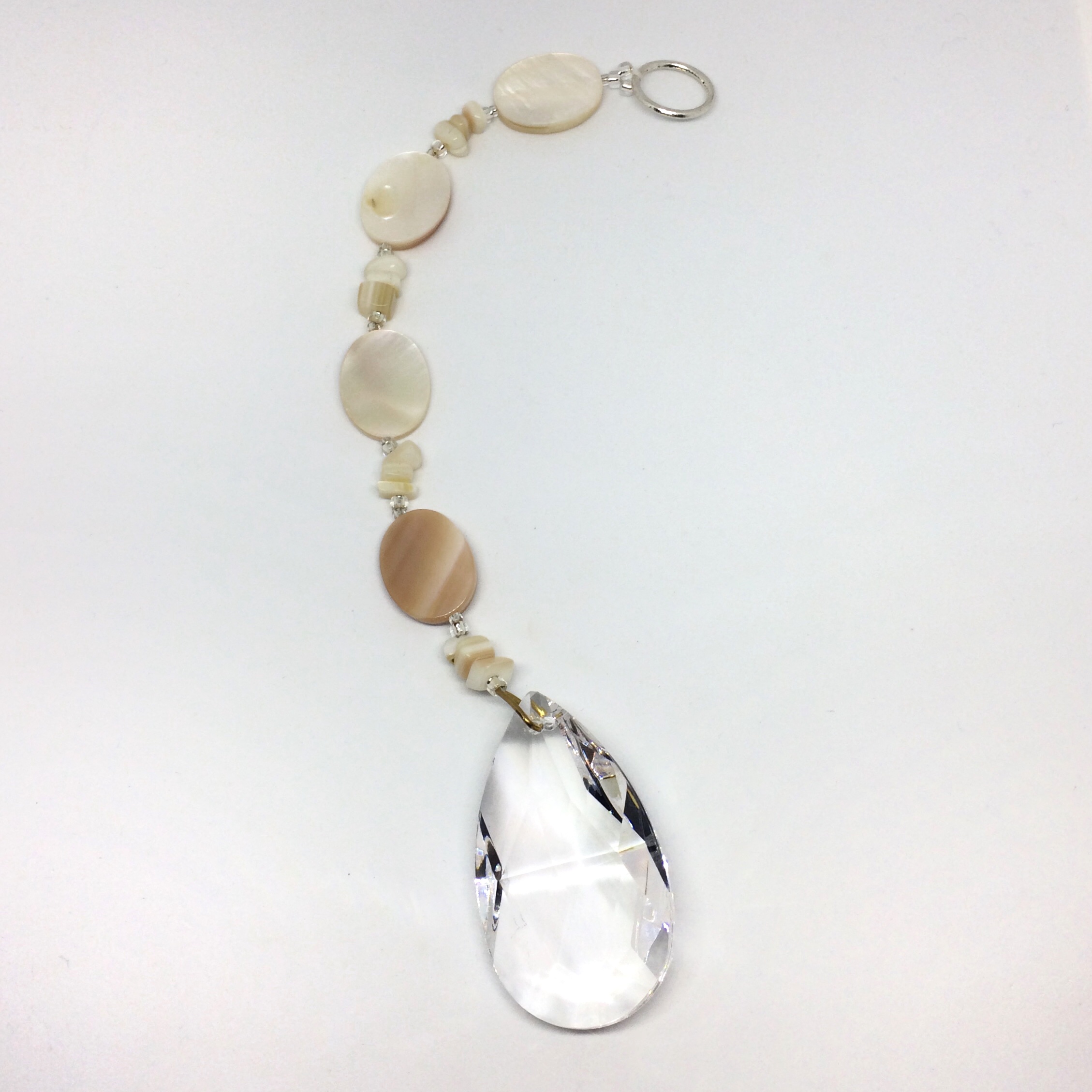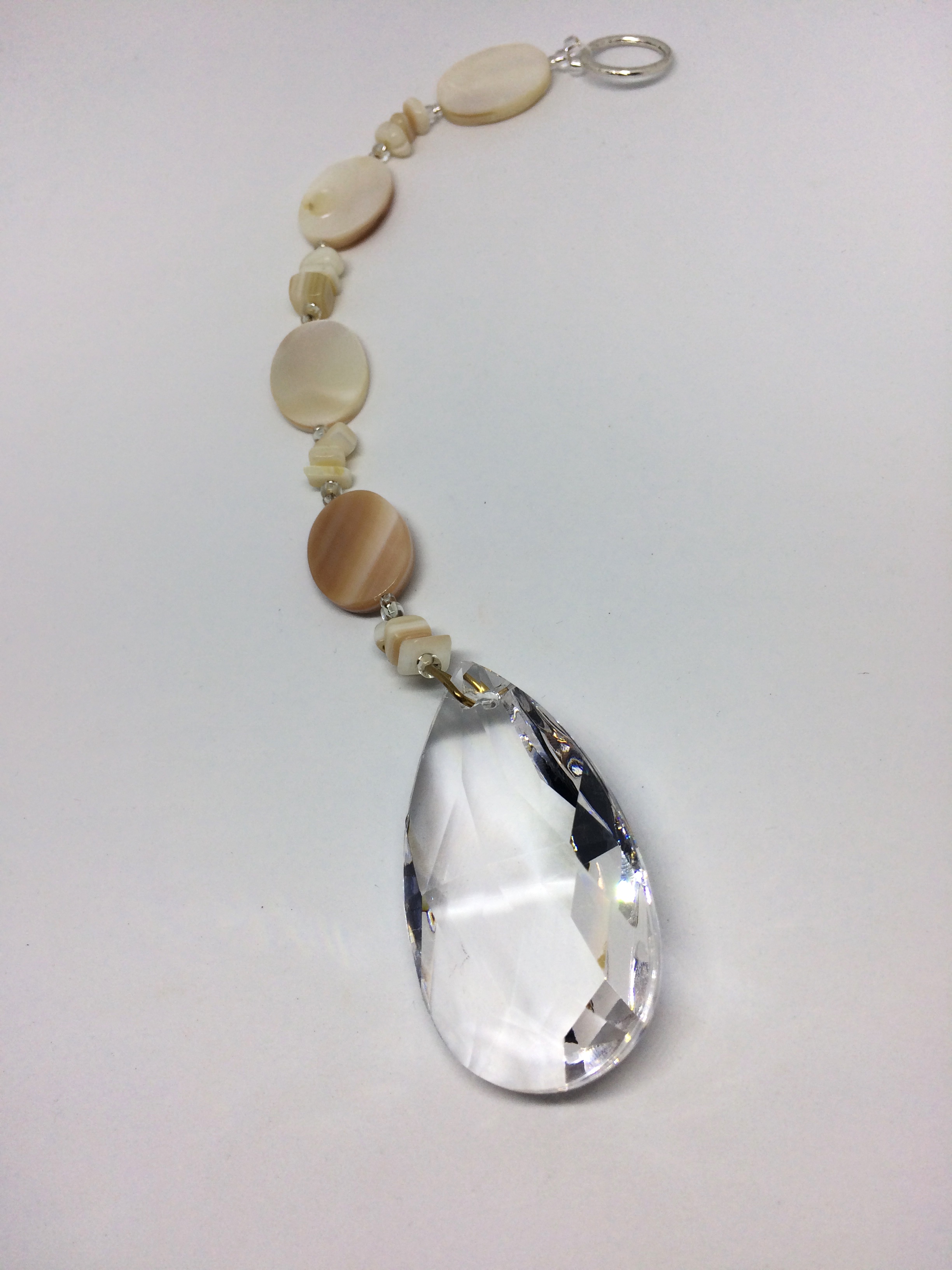 I paired this tear shape Asfour prism with genuine Mother-of-Pearl ovals and chips for a beach inspired look. The total length is 8.75". Prism is 2 inches long.