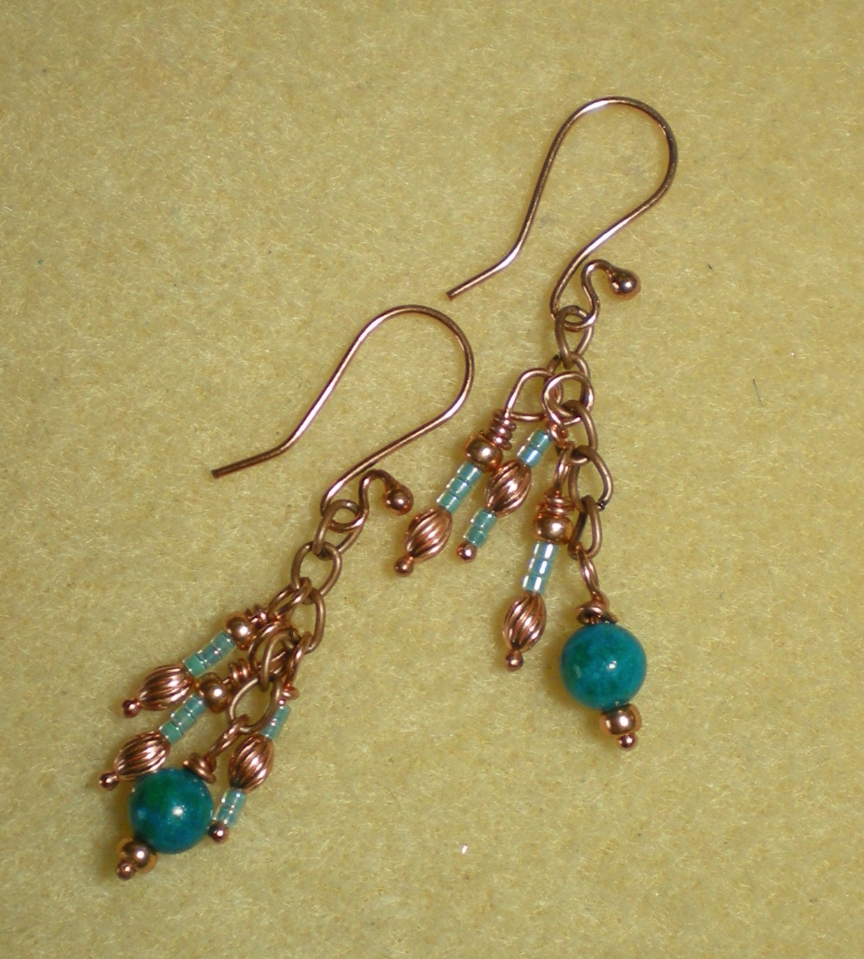 One of my favorite color combinations is turquoise and copper. These earrings have a beautiful teal green color jasper with copper beads hanging from copper ear hooks. Because the beads are hanging off chain, there is a wonderful movement to these earrings when you are wearing them. These earrings are made to order, so please allow an extra 5 days for completion. The stones are natural, so some variations from the picture may happen.