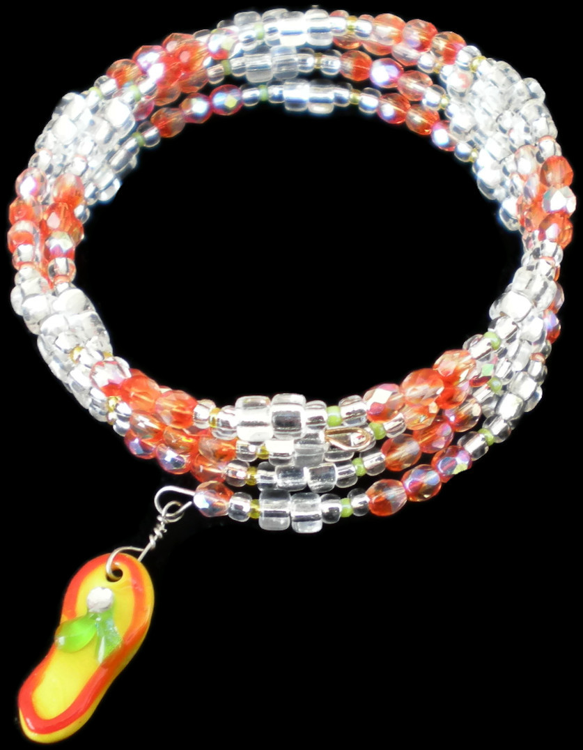 I made this bracelet for you, the person who loves summer all year round! This handmade bracelet is made out of stainless steel wire which will keep it's shape, silver and orange glass and crystal beads with a glass flip flop charm which dangles from the end. There are four coils.