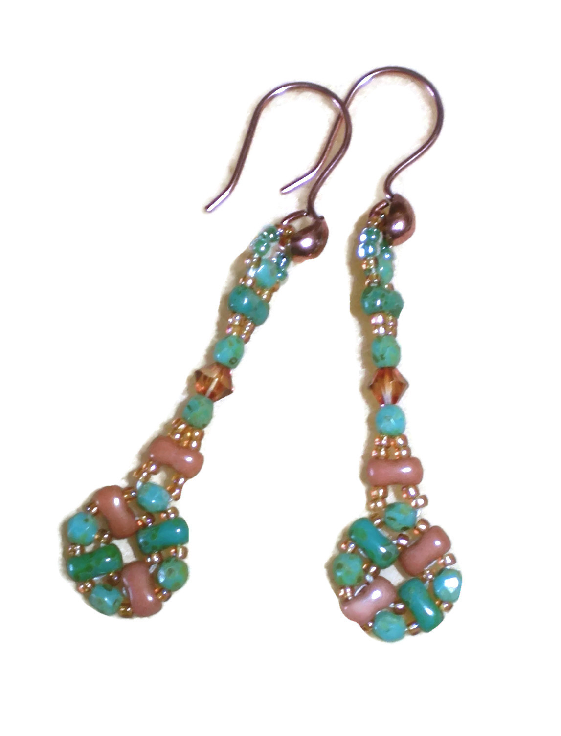 I wove glass beads and Swarovski crystals into a pendulum style earring. The colors on these earrings are amazing. The turquoise color used in the glass beads has so much depth to it. The copper color glass beads are almost peach, but earthy. I adorned the stalk with a brighter copper color Swarovski crystal.