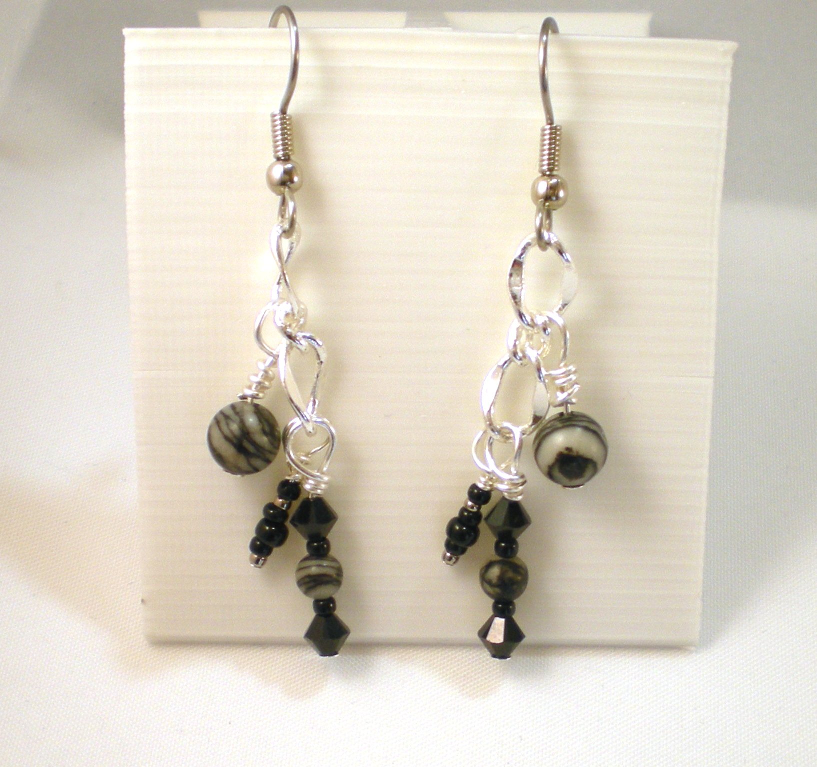 These will be your next "go to" earrings. Let's face it, black and silver go with most of your wardrobe. I used some fabulous natural Black Silk Stone beads and paired it with black swarovski crystals. I then hung the dangles from some lovely silver plated chain to add wonderful movement to the earrings.