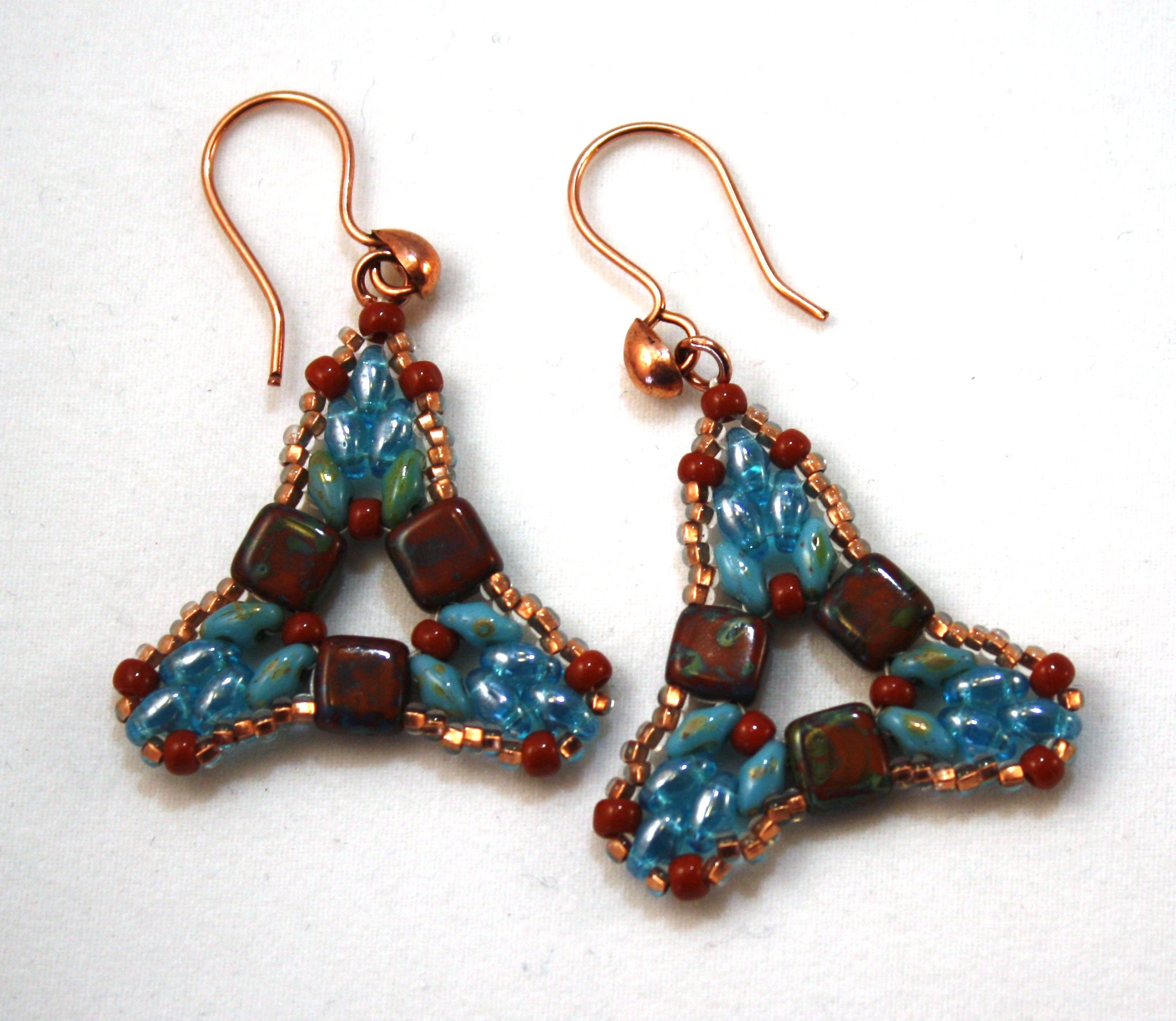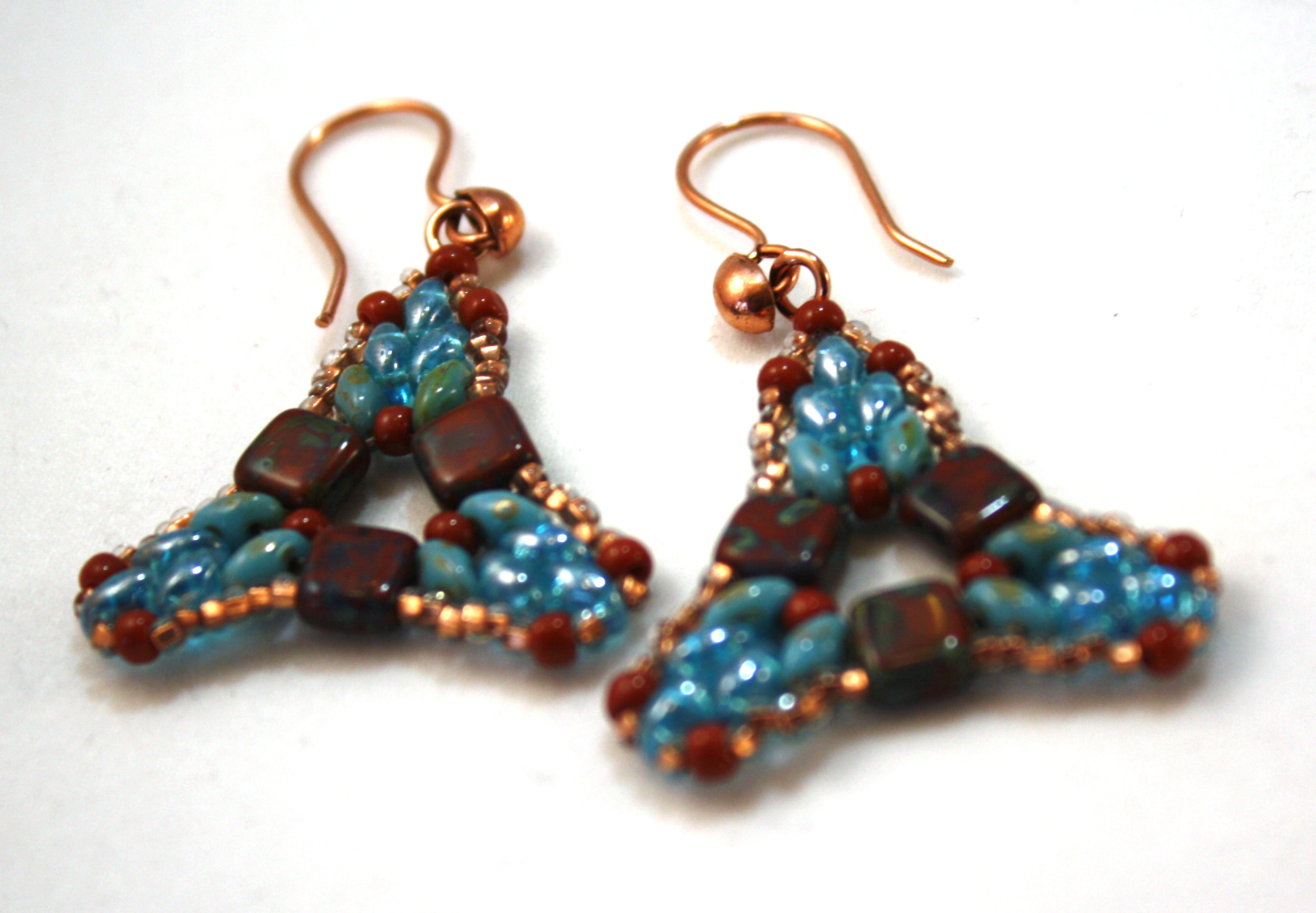 Beautifully shaped hand woven earrings. I used wonderful earthy tile beads in the center and wove aqua color and copper color glass beads to create a triangle shape. You are going to love wearing these earrings!