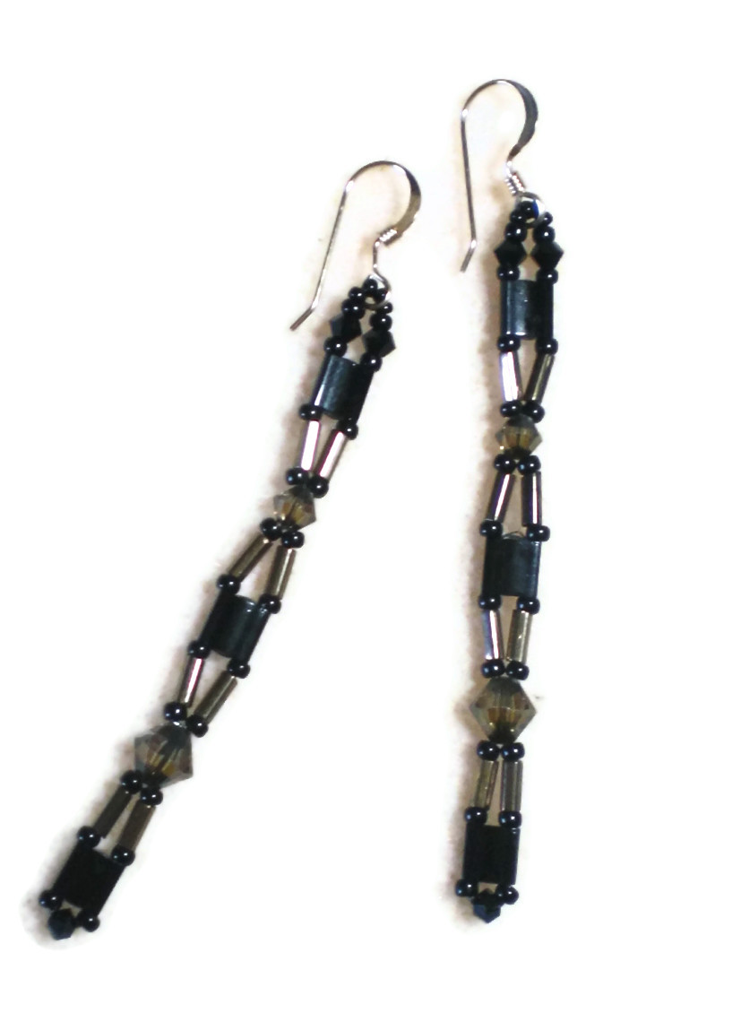 Beautiful, sparkling, shoulder duster earrings. Hand woven, black glass beads, and bronze and black Swarovski crystals. Ear hooks are gold filled.