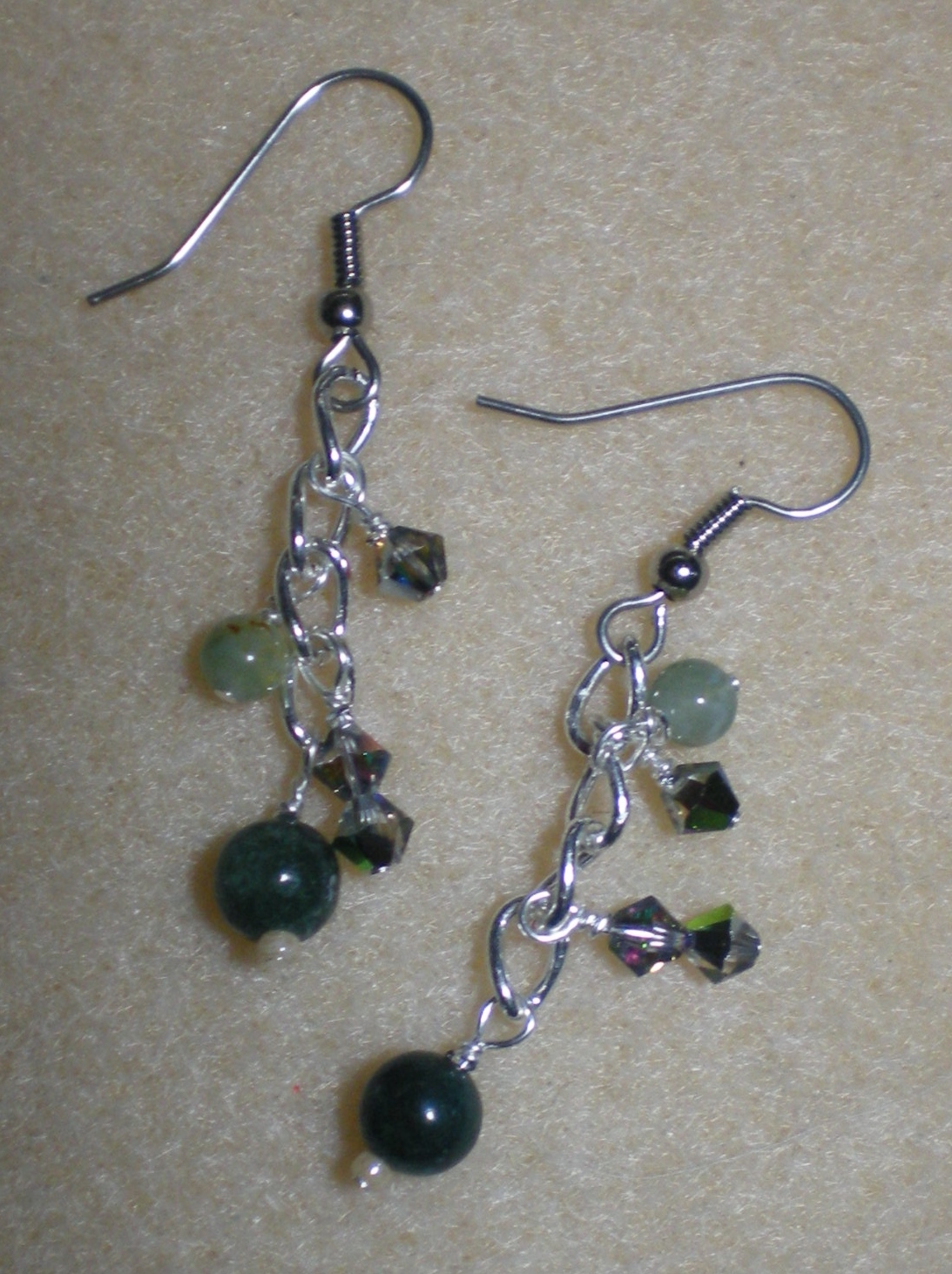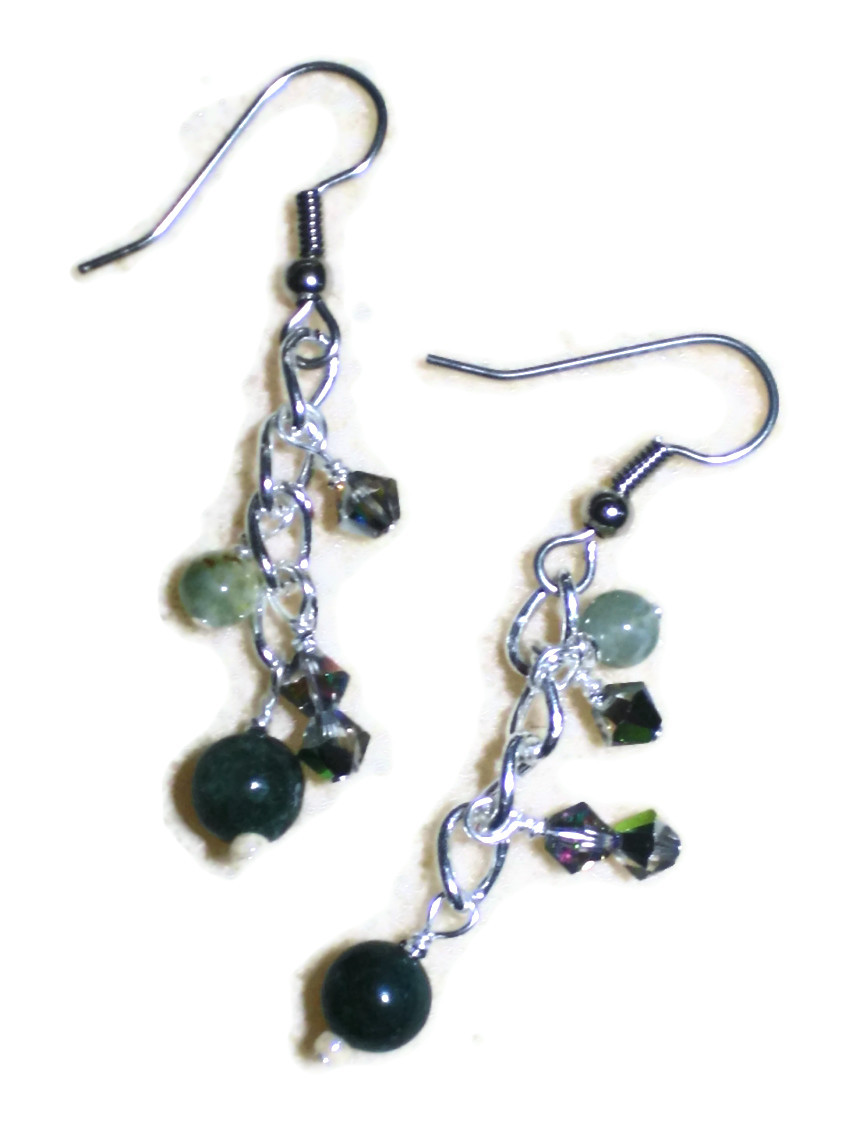 Silver Chain, Green Jasper, and Crystal Dangle Earrings
