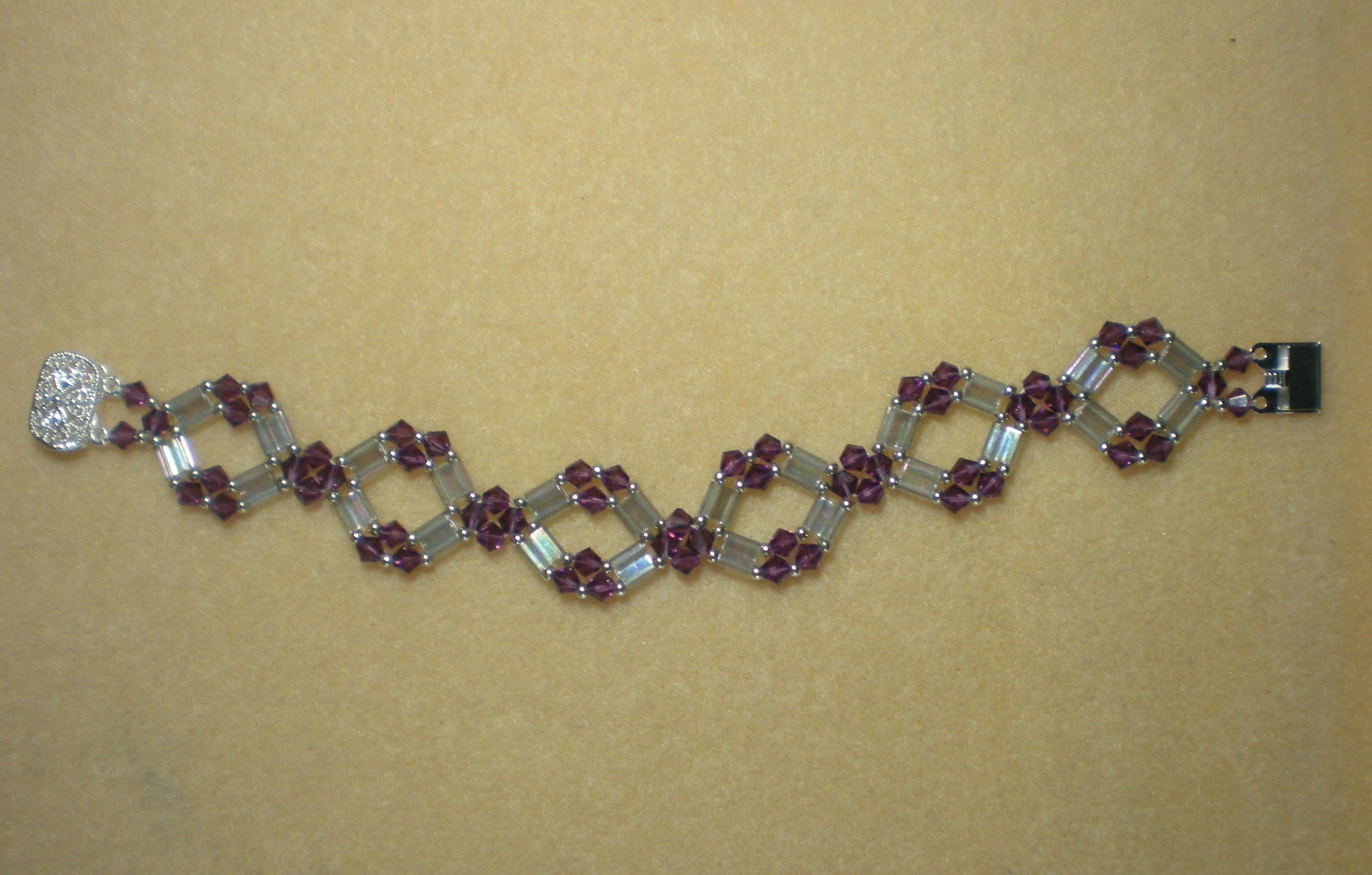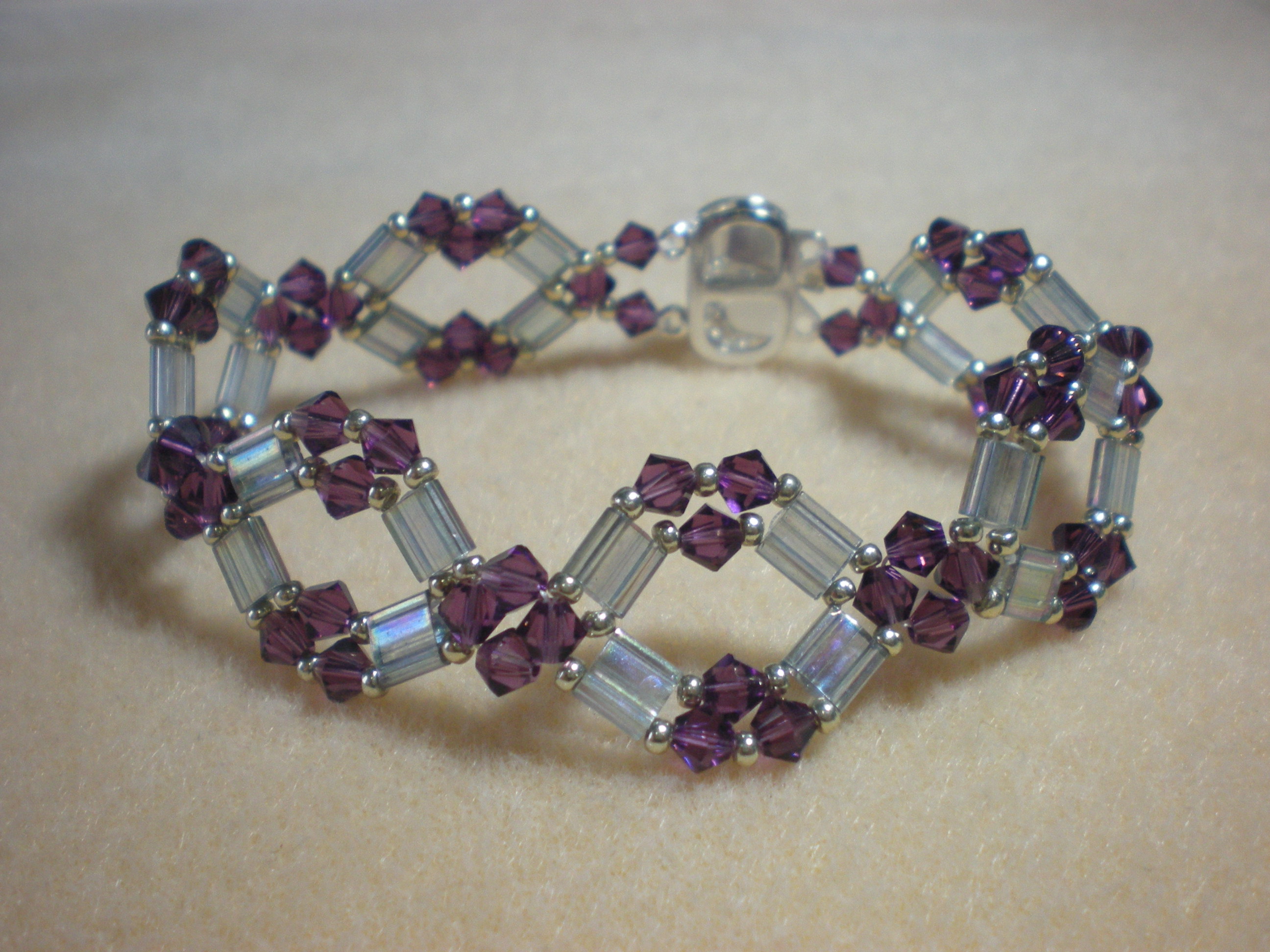 Hand woven bracelet using purple Swarovski crystals and slightly iridescent glass cubes. Clasp is a beautiful filigree silver plated push tab, very easy to use. Length is 7.25 inches long and can be adjusted upon request. Gotta love that handmade jewelry! Note: these are made to order, please allow an extra three weeks for shipping. Also, there may be some slight variations from the photo due to the handmade nature of the product.