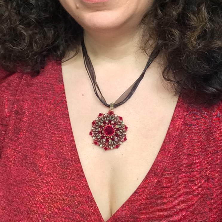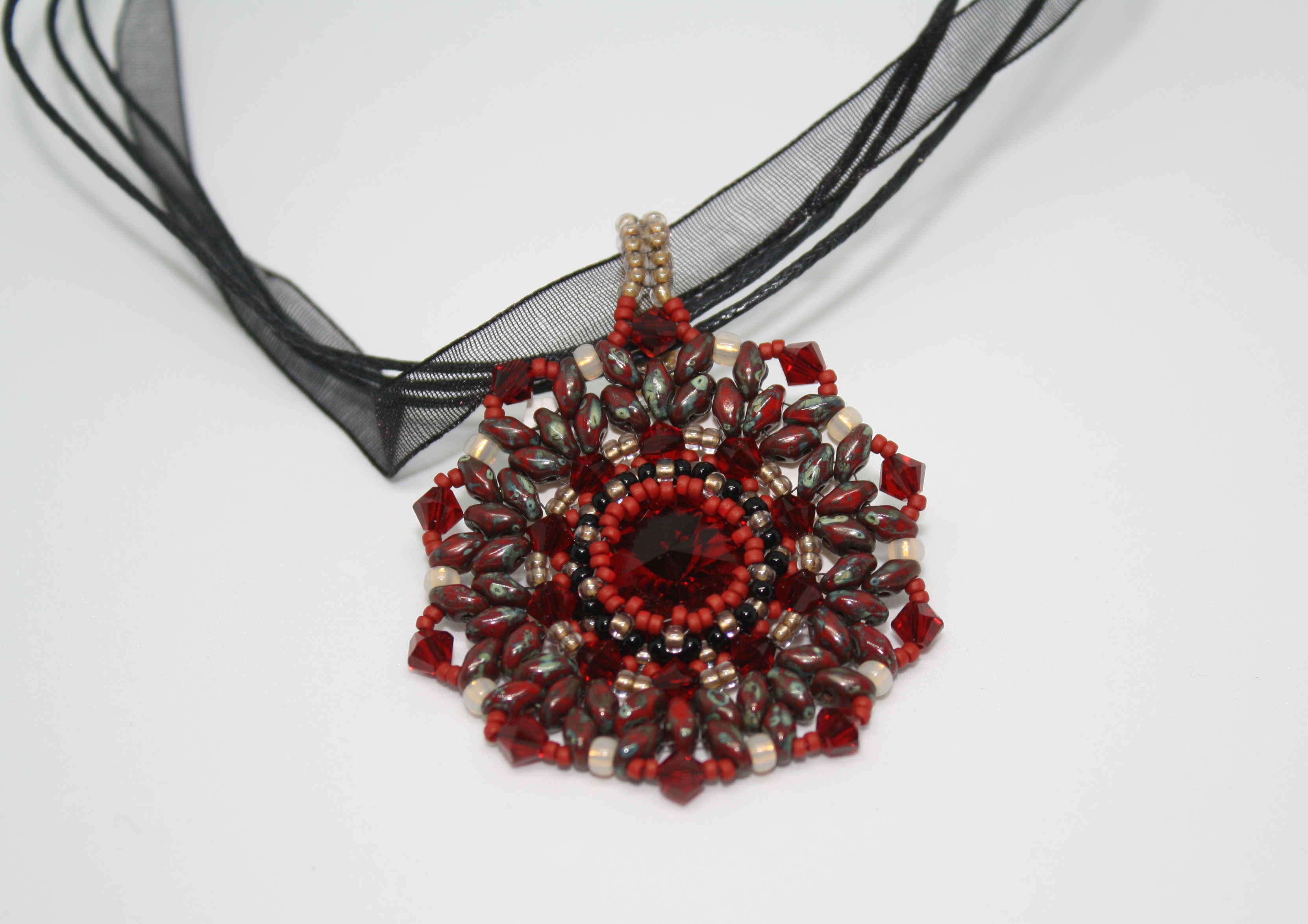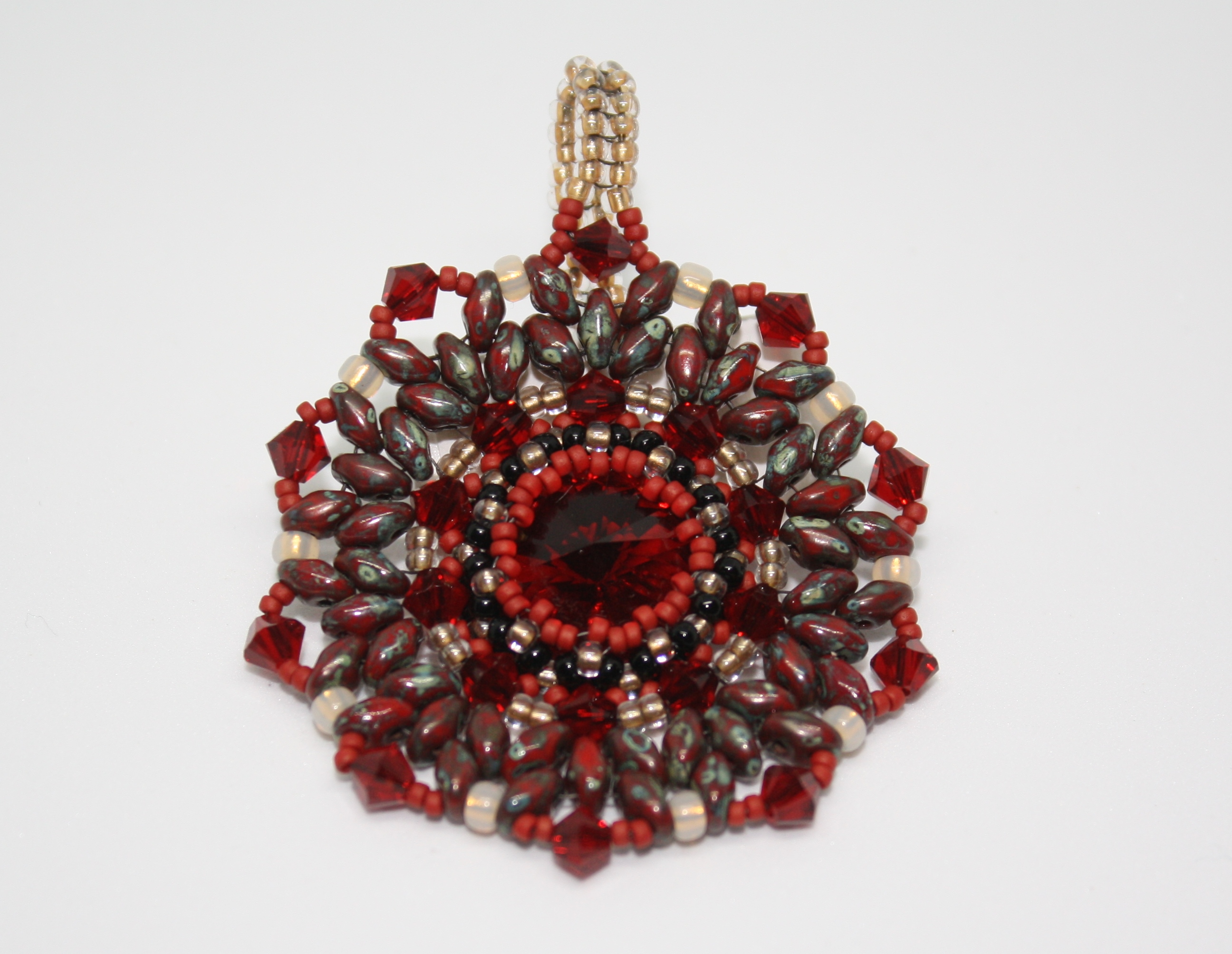This sparkling pendant is loaded with Ruby color Swarovski crystals, including the center crystal. Enjoy this Mandela circular pattern of woven crystals and glass beads. The loop is large enough to fit on almost any chain, hoop, or ribbon.