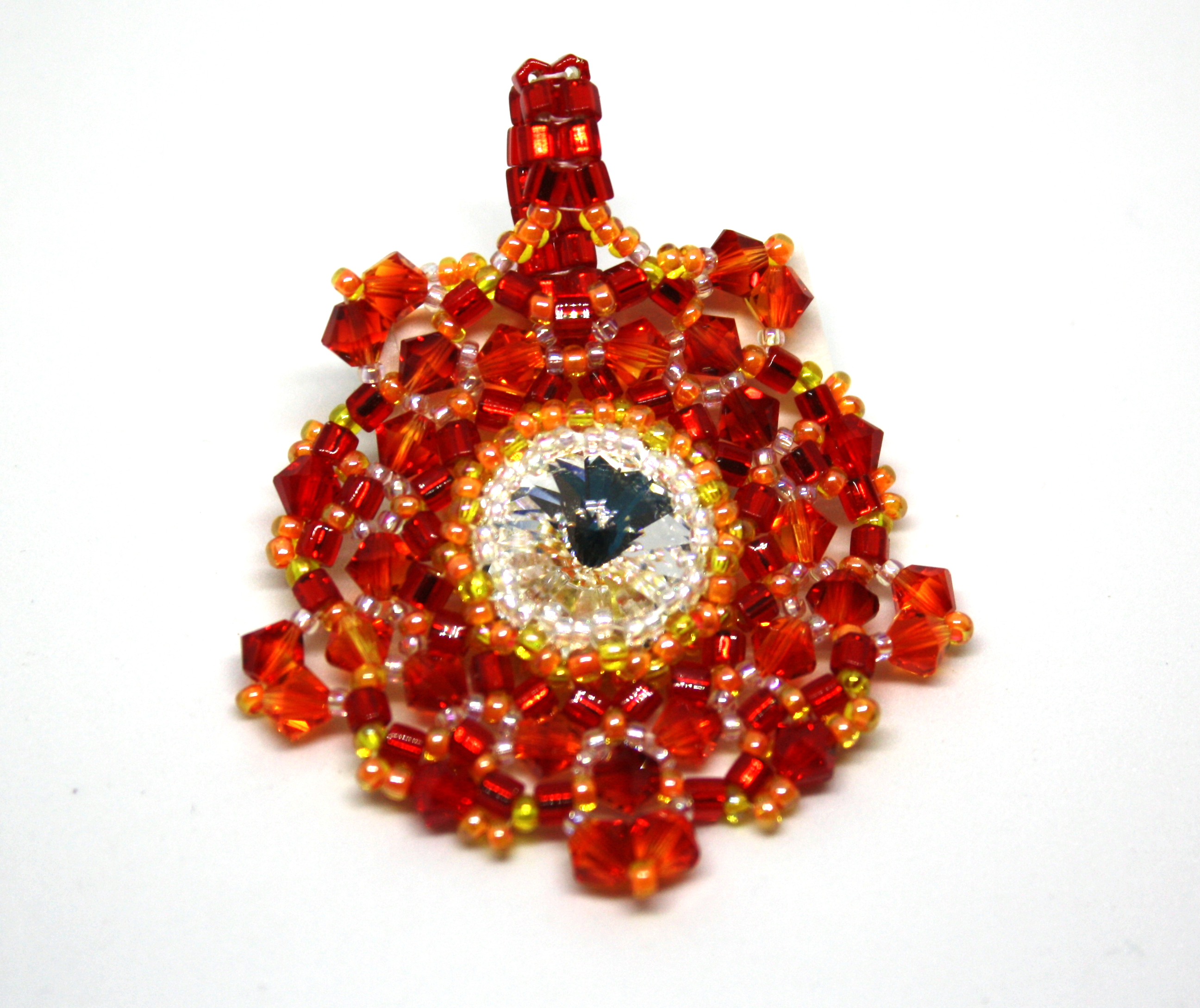 This sparkling pendant is loaded with red and orange color Swarovski crystals, the center is a white crystal. Enjoy this Mandela circular pattern of woven crystals and glass beads. The loop is large enough to fit on almost any chain, hoop, or ribbon.