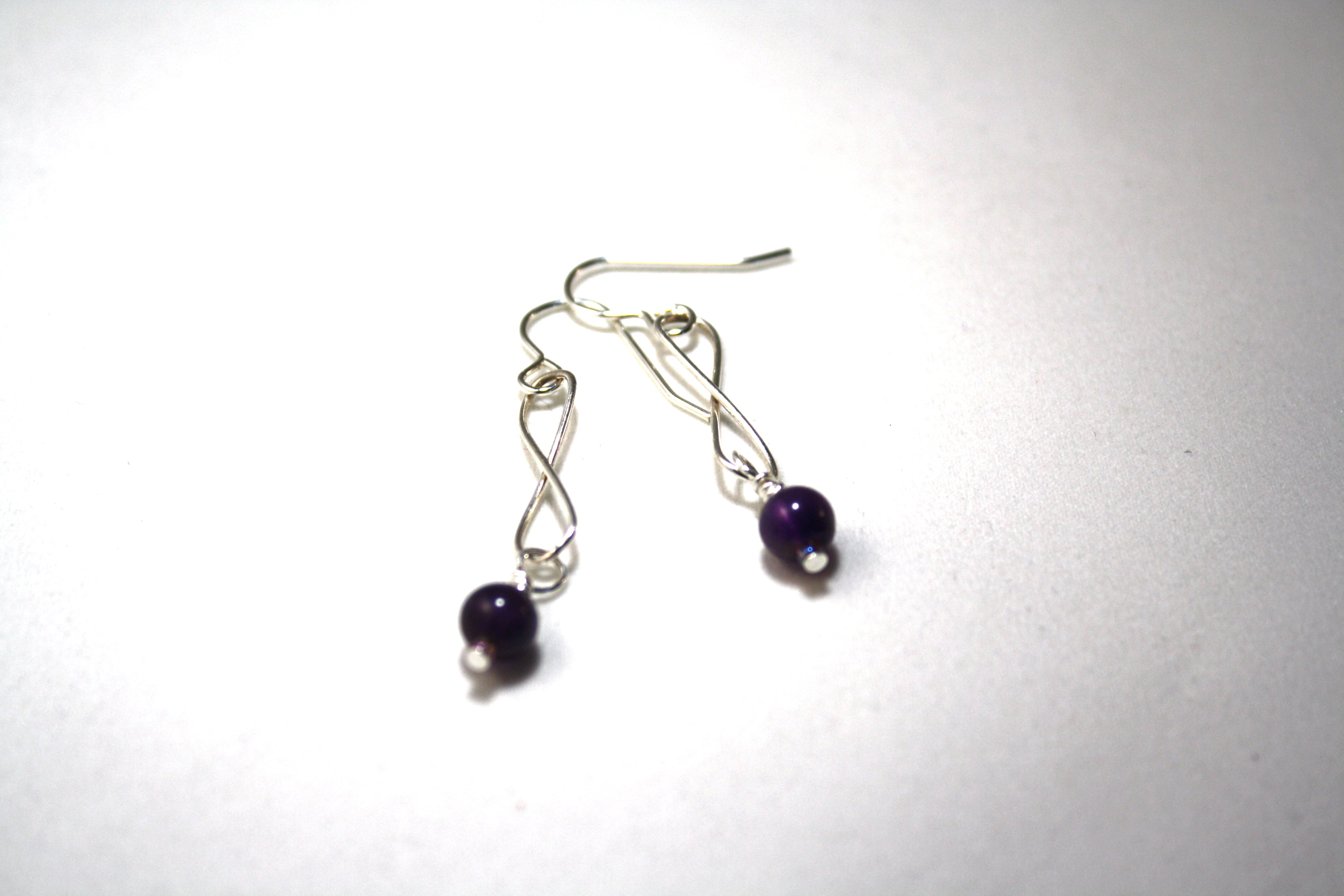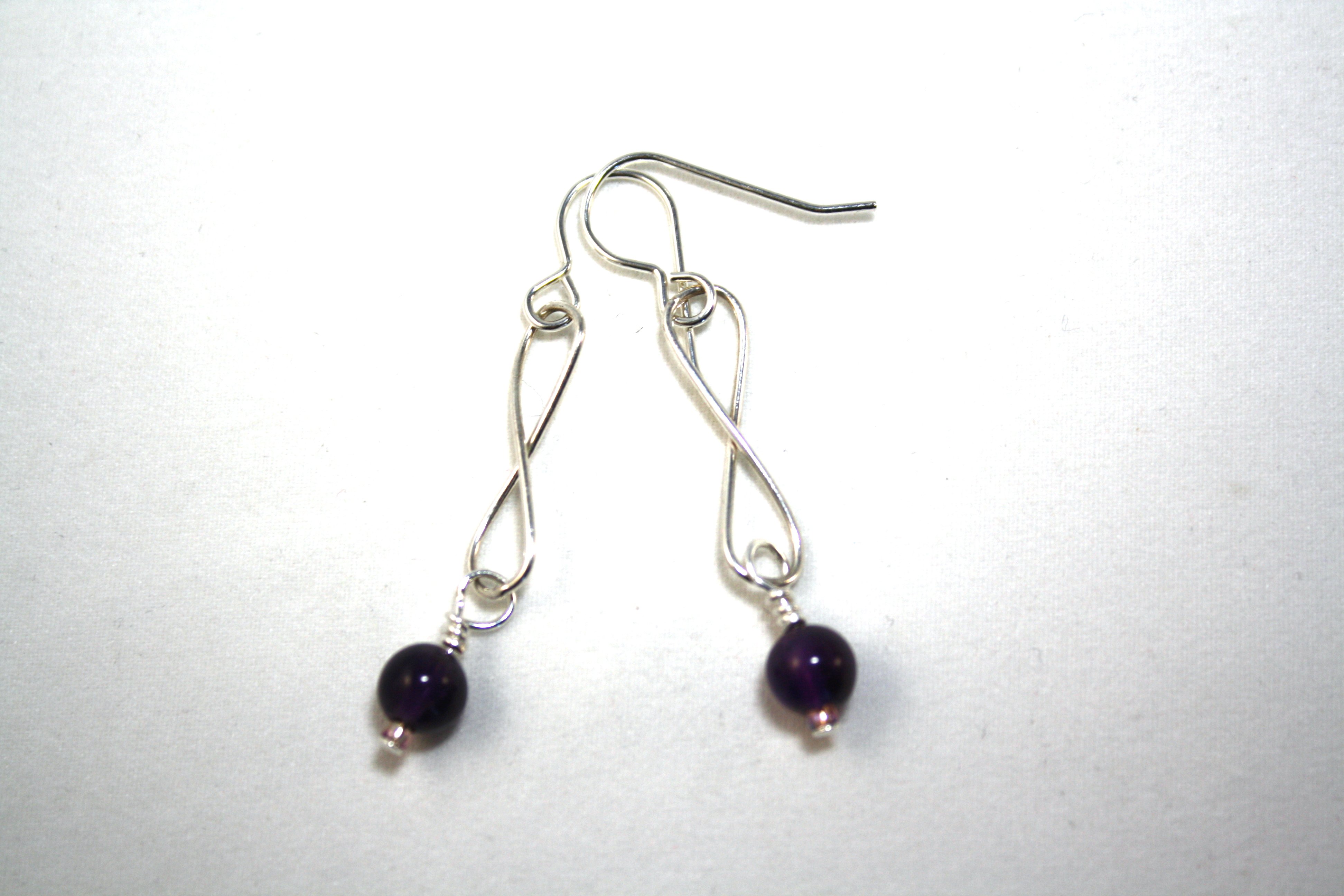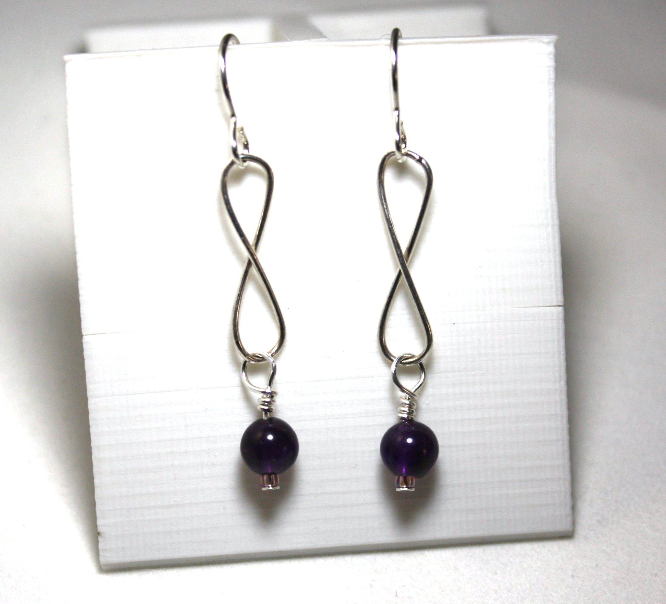 An elegant Amethyst bead hangs from sterling silver infinity shape chain. Ear hooks are sterling silver. The Amethyst is a B-Grade dark purple. These are lovely.