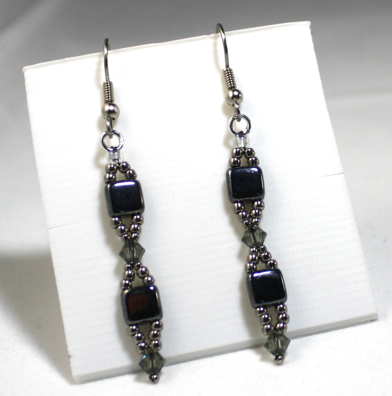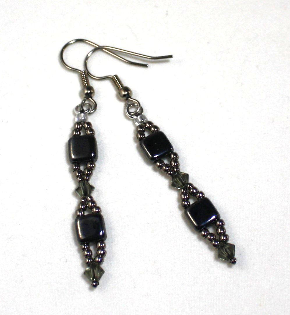 Gray is the new fashion color this year and I have designed these earrings with three shades of gray. I used a metallic nickle color gray small glass bead, square Hematite color glass beads, and medium gray crystals.