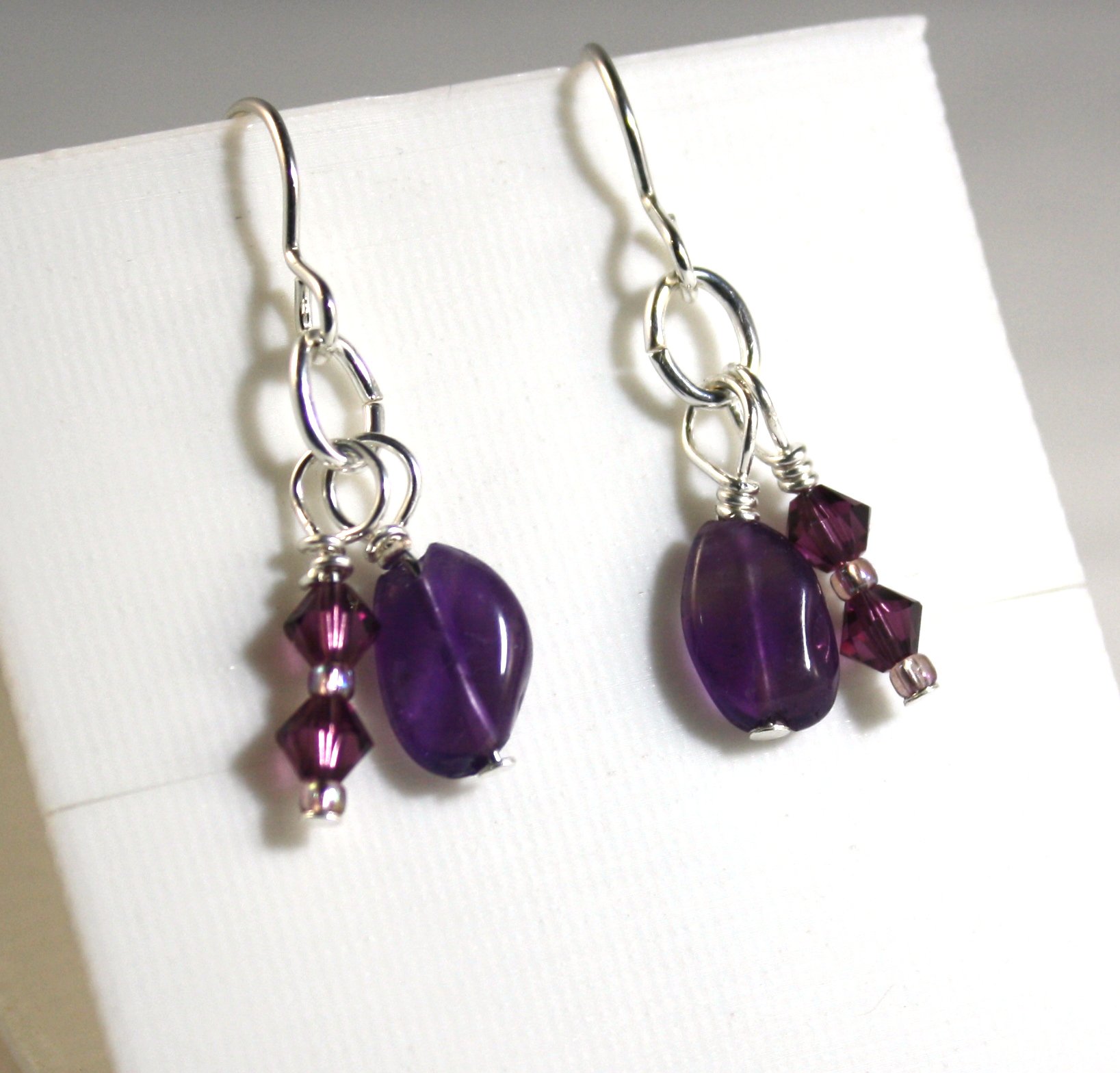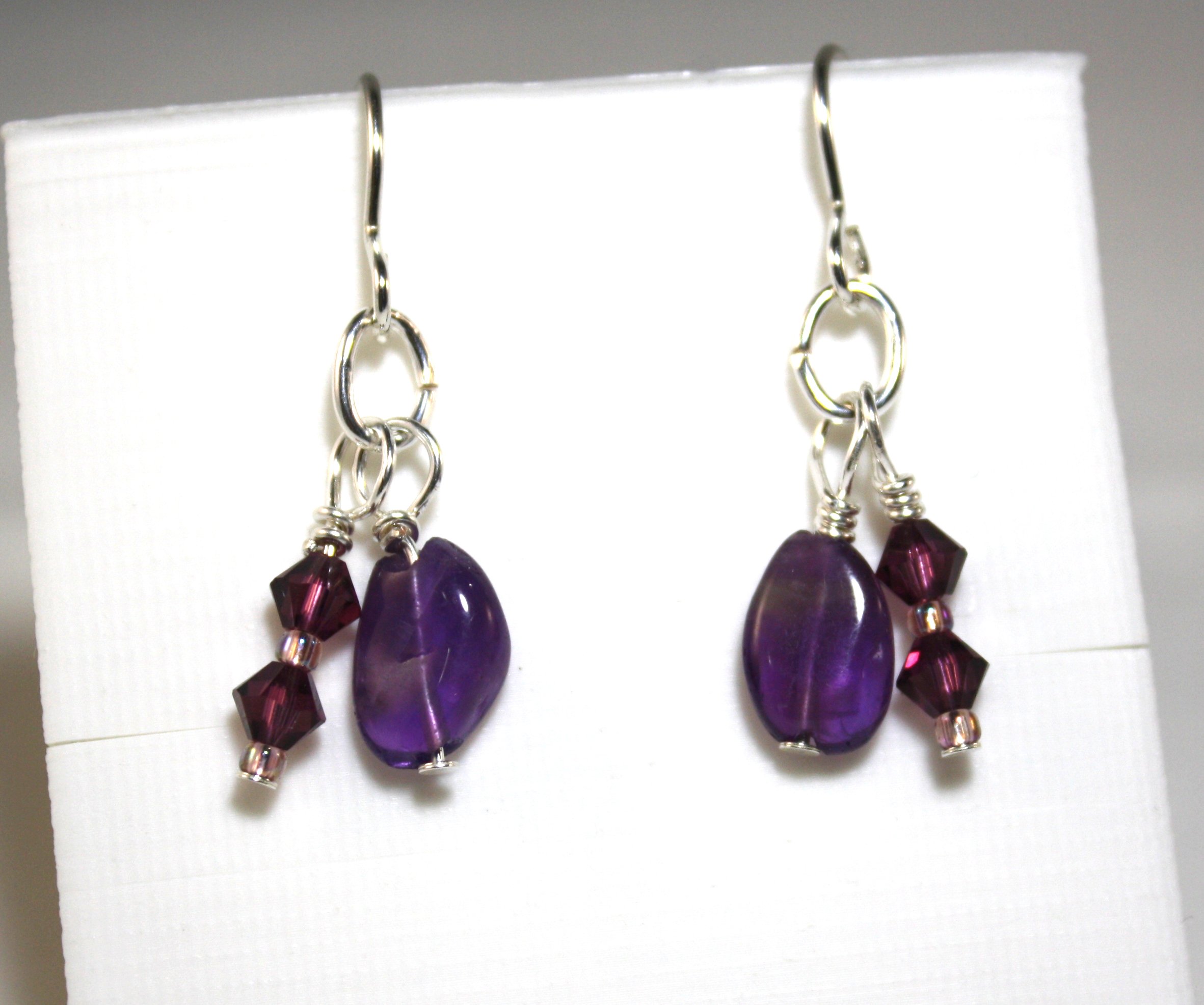 Amethyst Gemstone and Purple Crystal Earrings on Sterling Silver Ear Hooks