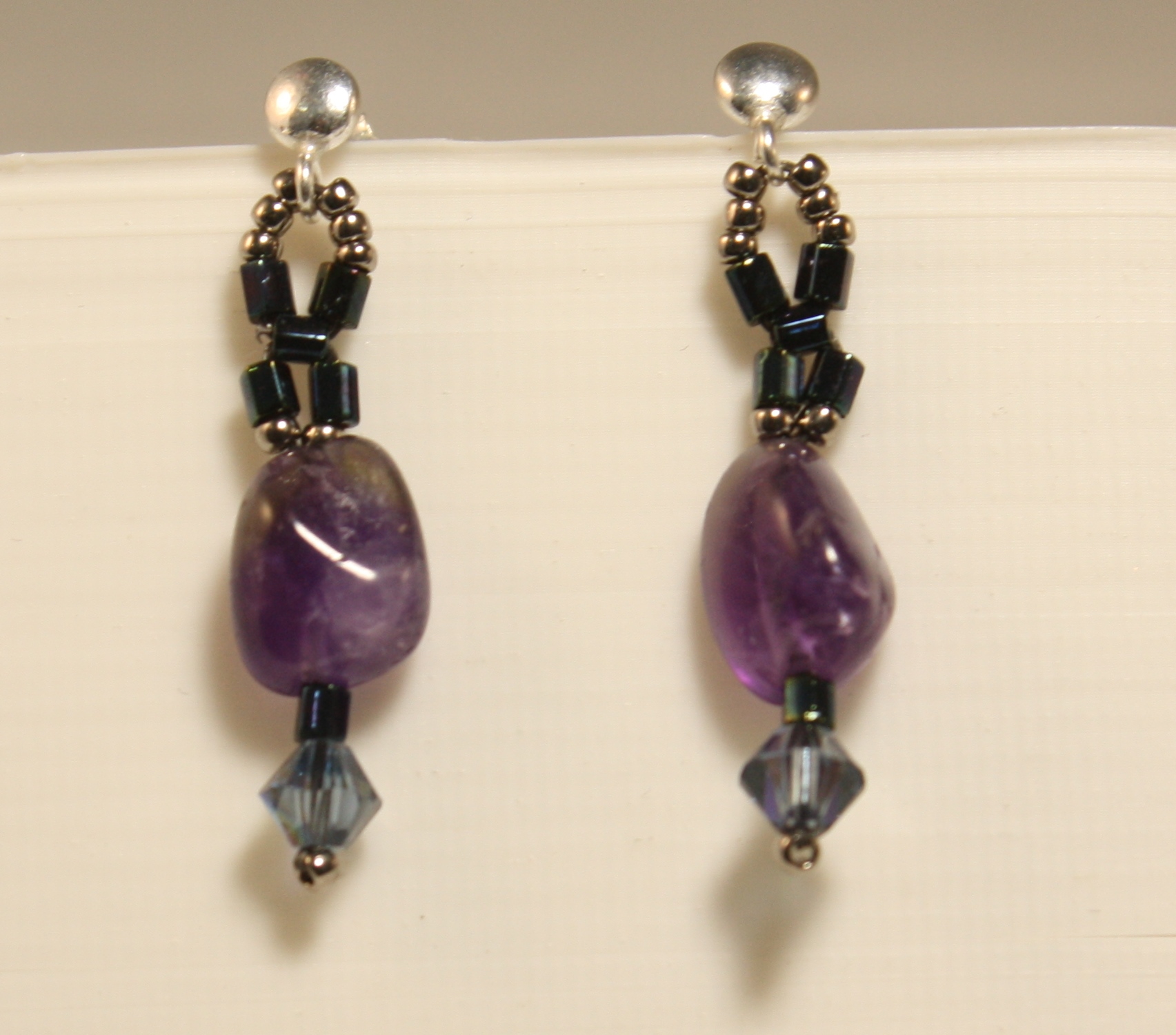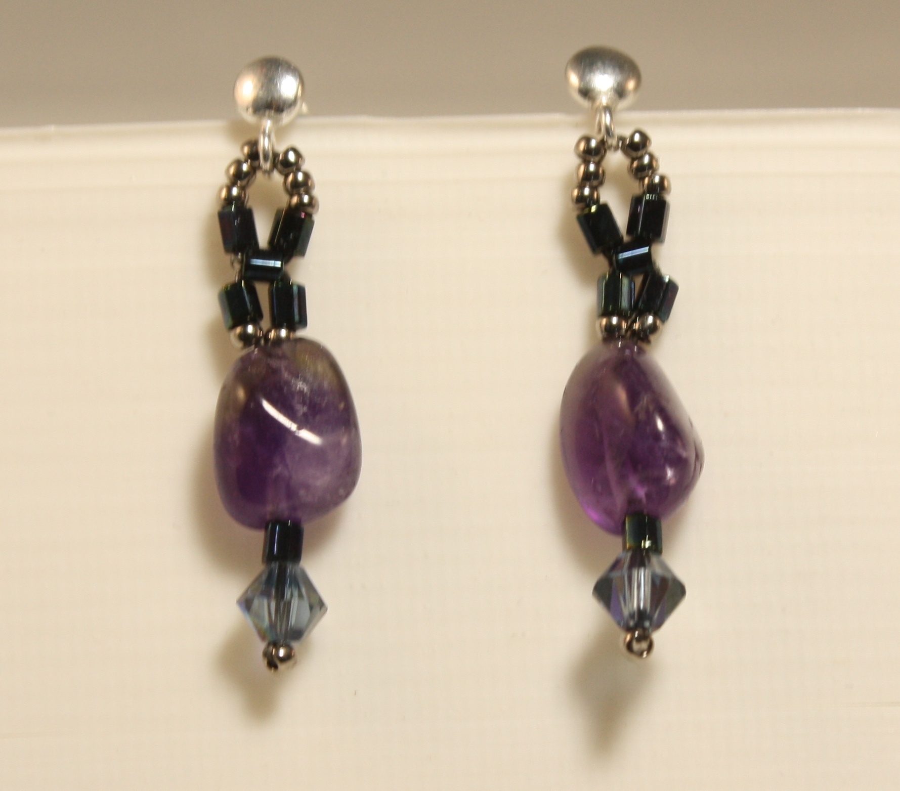 Dainty polished Amethyst gemstone and crystals hang from sterling silver stud posts. These are lovely little earrings. They hand down just over an inch from top of stud.