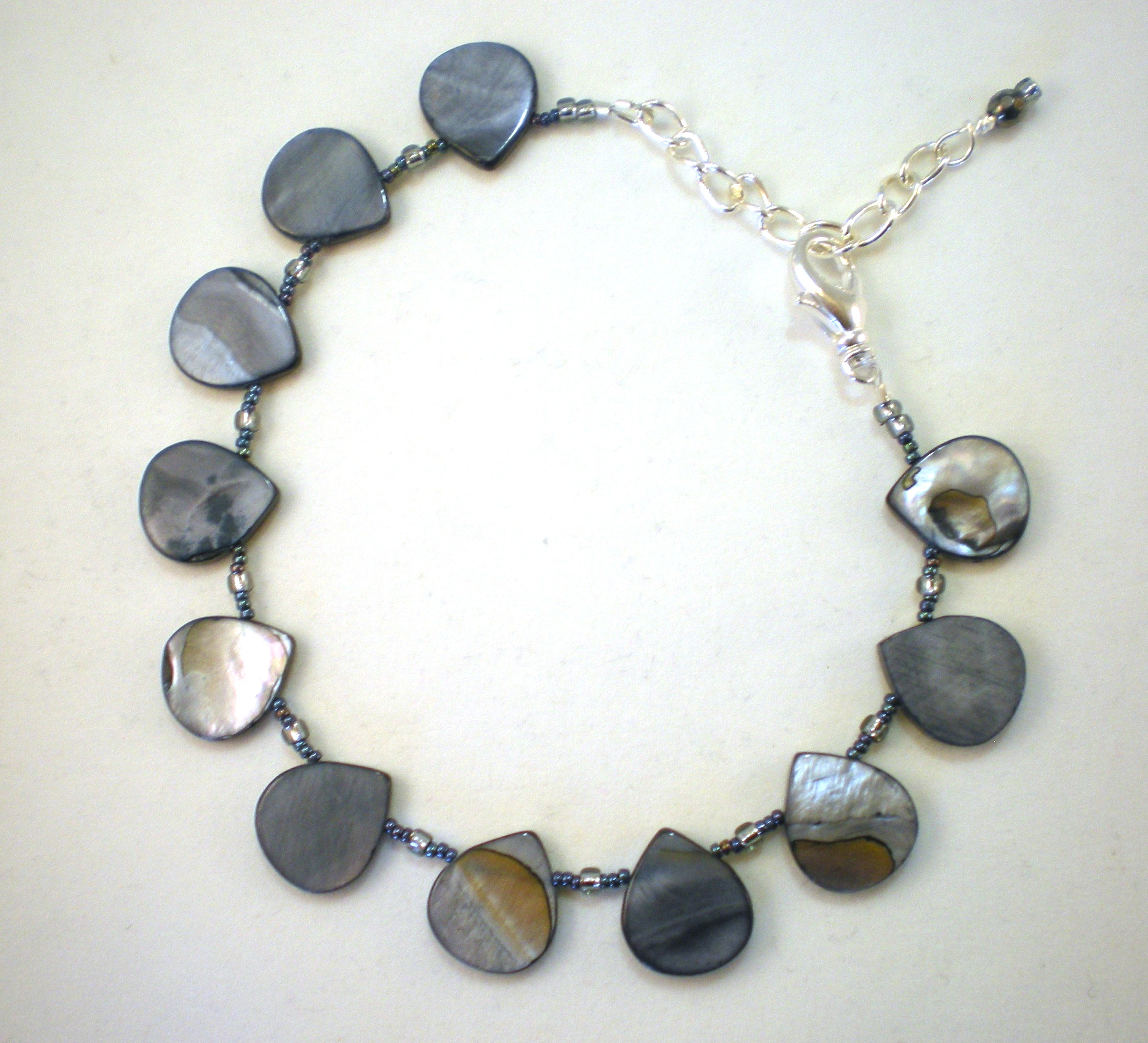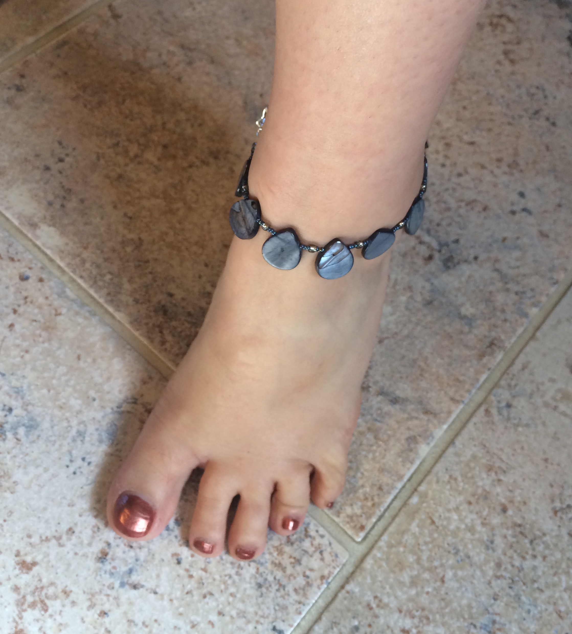 You will love this versatile anklet! Lovely tear shape mother of pearl beads dyed a steel blue adorn this ankle bracelet.
