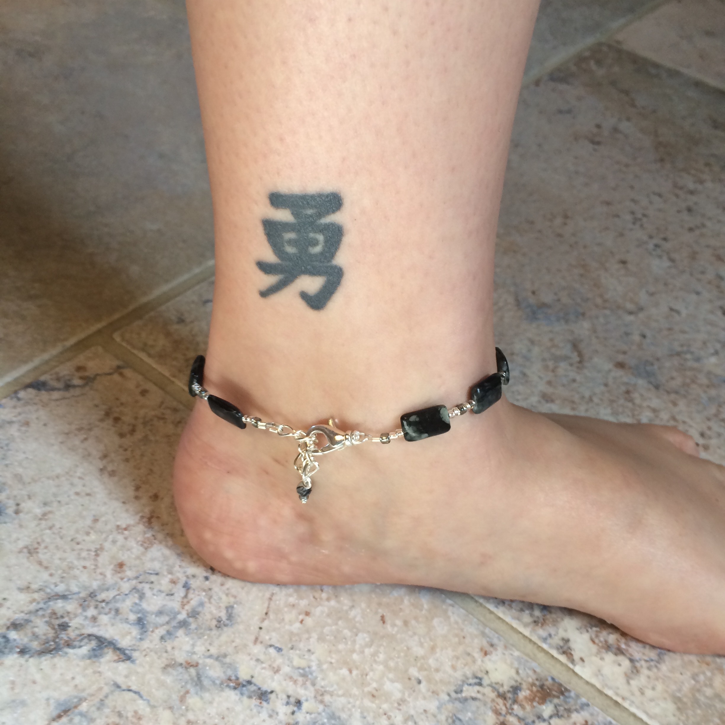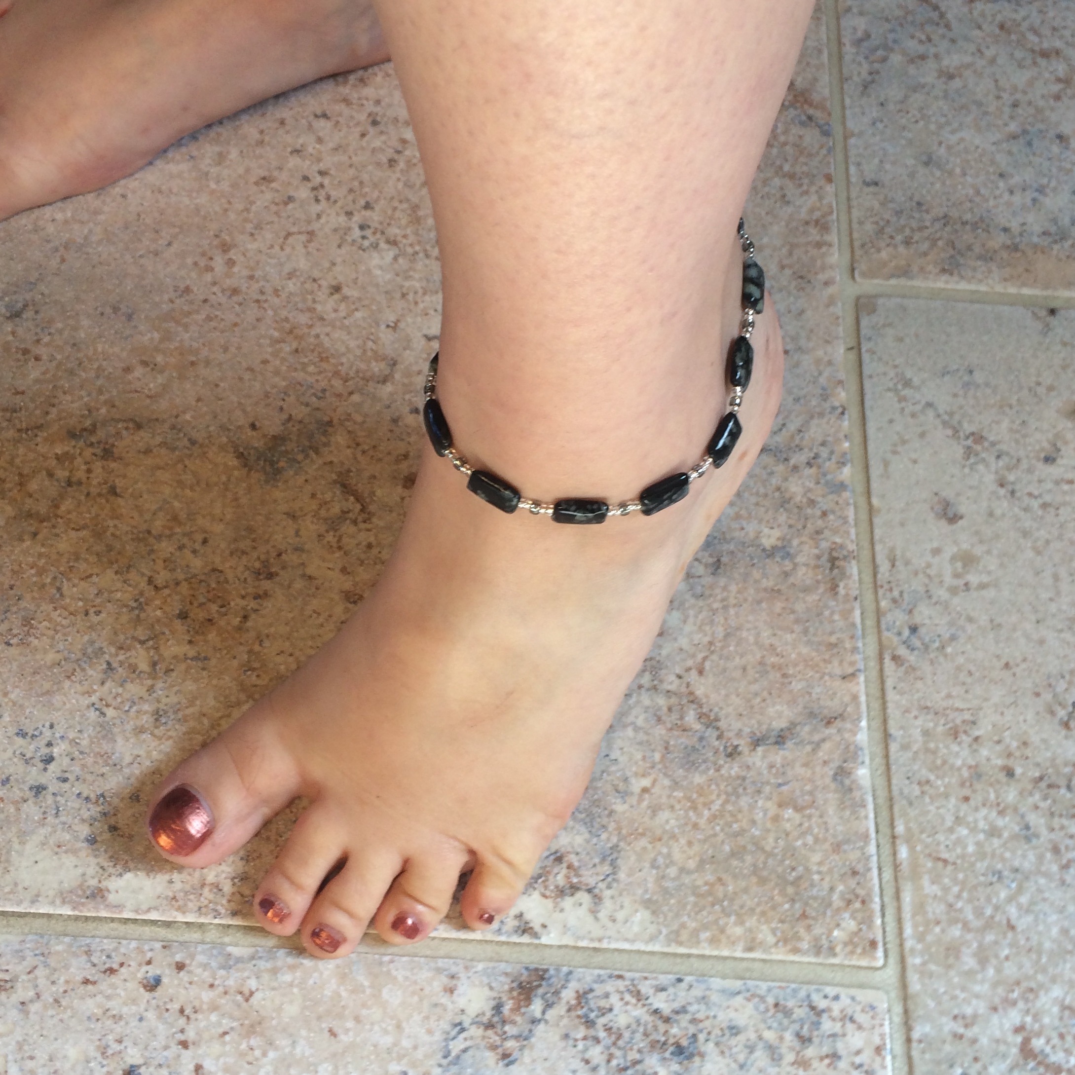 Looking for an ankle bracelet to match every sandal? Here it is. The rectangle Picasso Stone beads are mostly black, but have varying gray swirls in them. The glass beads are silver and gray.