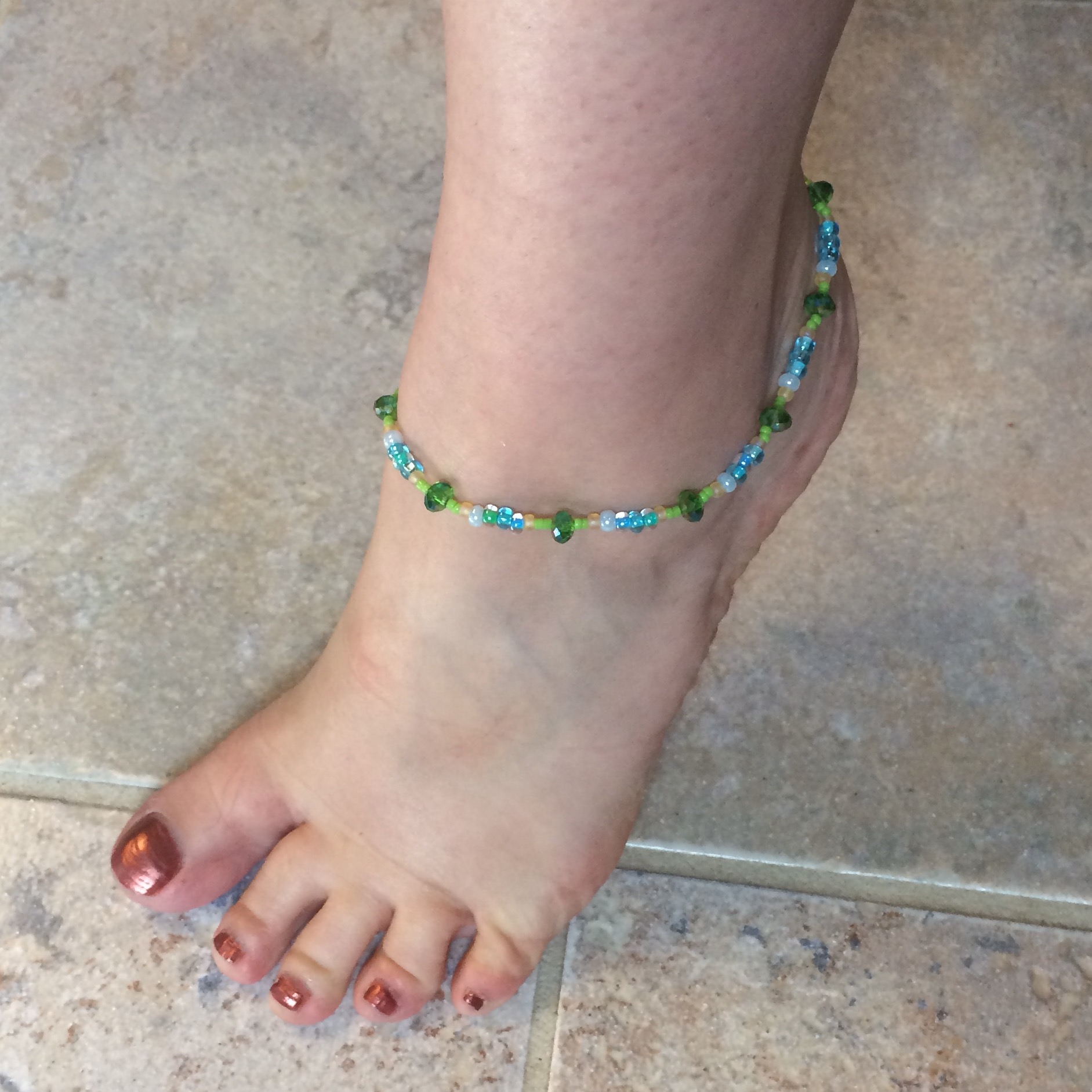 Breaking out your fun summer wardrobe? Well, this is the perfect ankle bracelet for you! I used lime green glass crystals and aqua glass beads in this fun anklet. I adorned the adjustment chain with a lime green fused glass flip flop charm, which is totally cute!