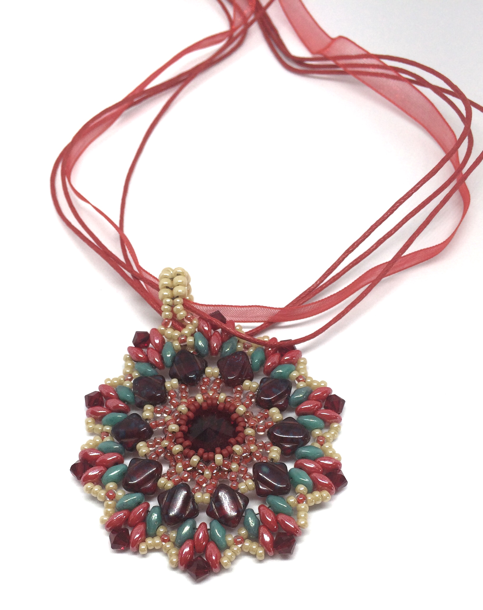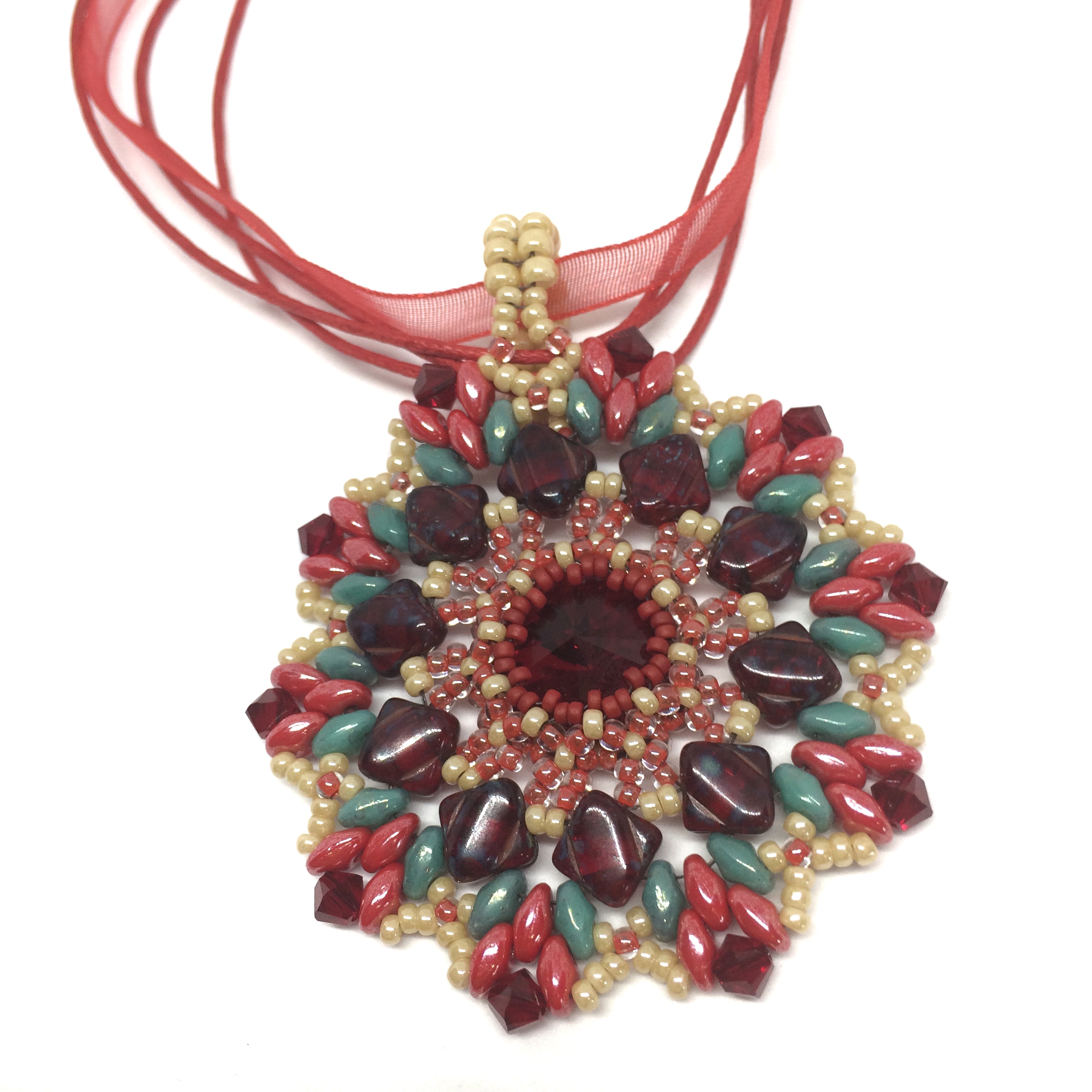 Nothing says "July" more than a ruby red crystal with colors of turquoise, coral, and sandy tan bursting forth around it. I edged it with more ruby red crystals to add some more sparkle. Enjoy this Mandela circular pattern of woven crystals and glass beads. The loop is large enough to fit on almost any chain, hoop, or ribbon.