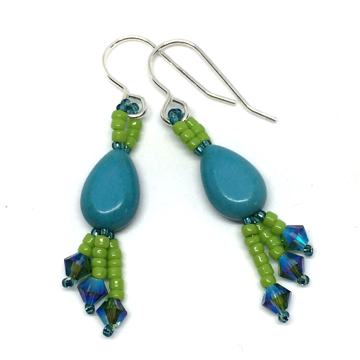 Lift your spirits with the tropical-inspired color of these aqua and lime-green sparkling earrings. I wove two-tone blue and green Swarovski crystals with lime green glass beads through a nice piece of magnesite dyed a lovely aqua color.