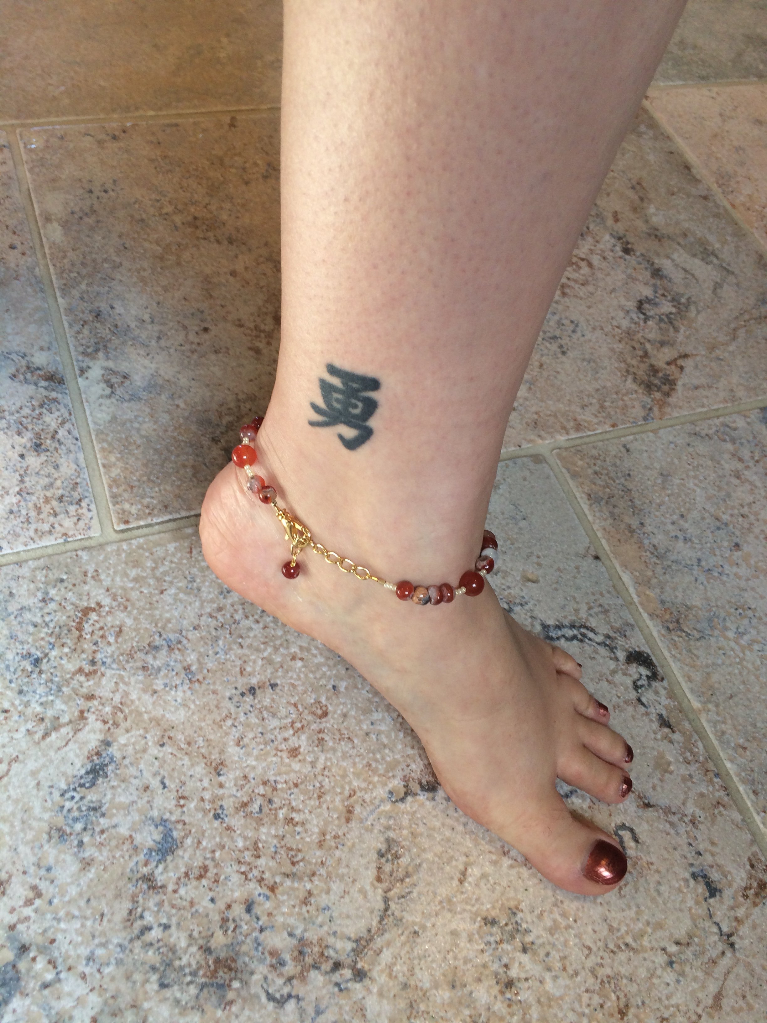Indulge your love of natural stones with this red agate anklet. While it's called red agate, it is mostly orange with brown and clear quartz striations. I accented the stones with cream colored glass beads for a lovely look with your sandals.