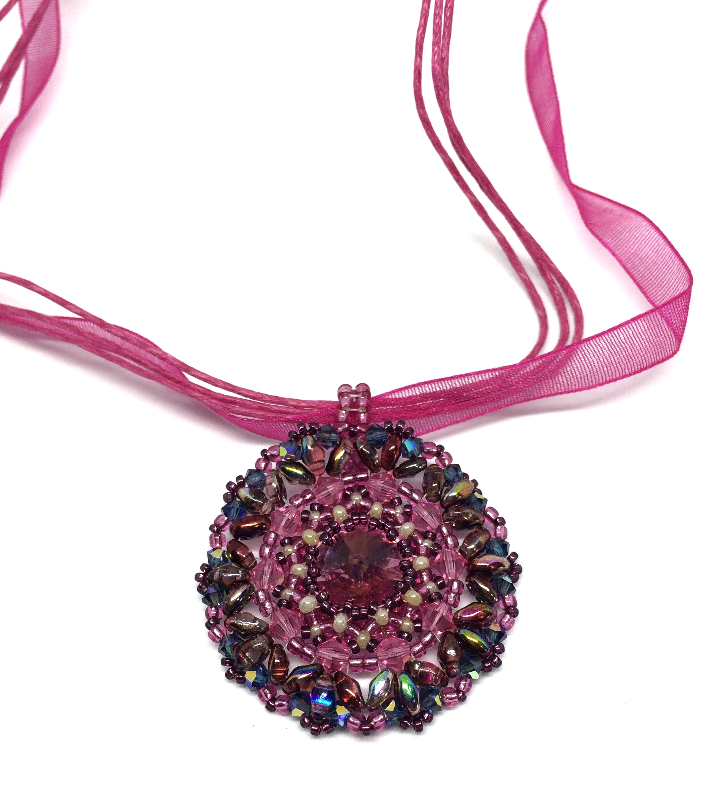 Show off your sparkling good taste with the unique beauty of this Rose crystal center for this Mandala style pendant. I also captured the spark of an opal by using multi-tone glass beads around the edge.