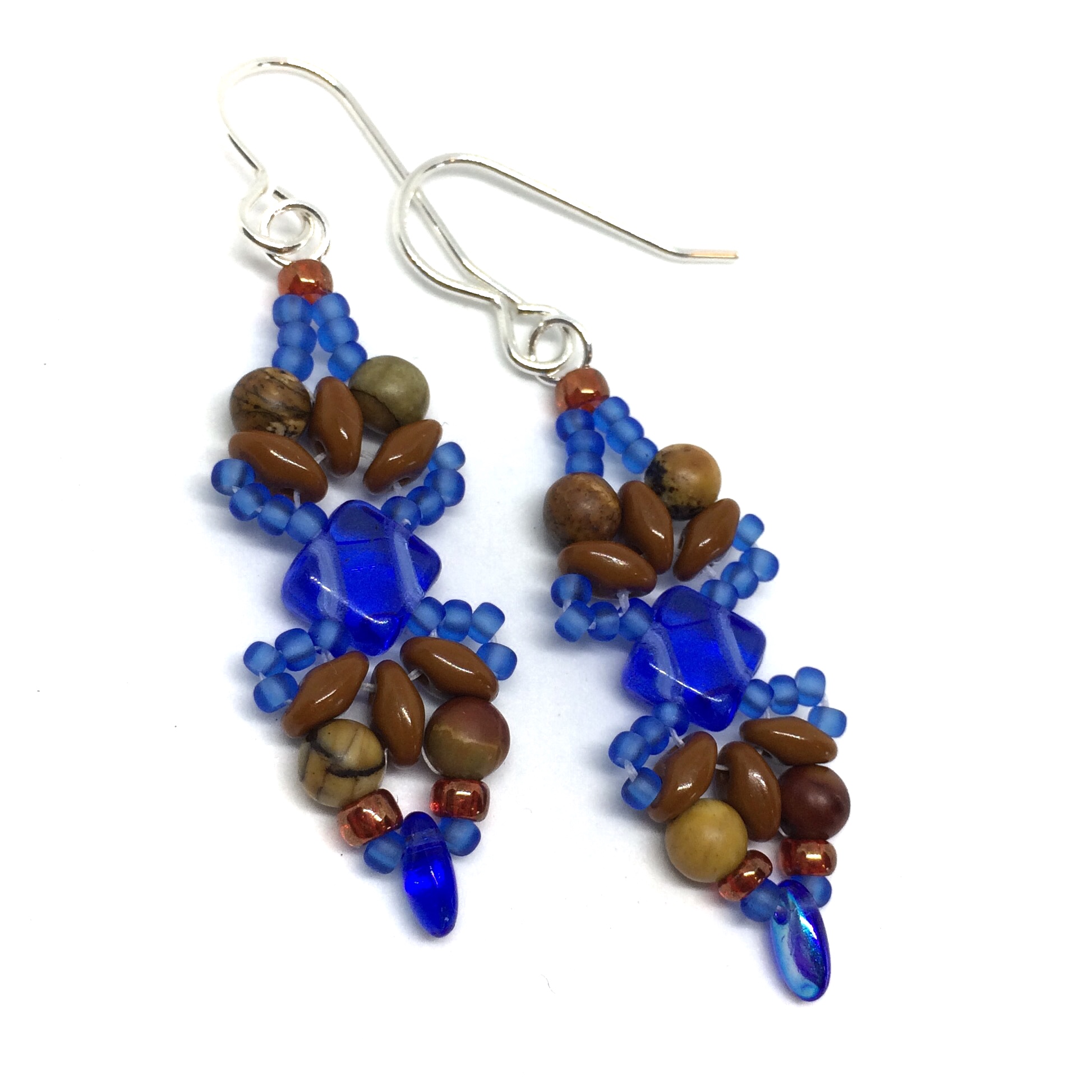 Get ready for some drama with these hour glass shaped royal blue and terracotta earrings. I wove together lovely blue glass beads and Mookaite Jasper into a unique hour glass shape.