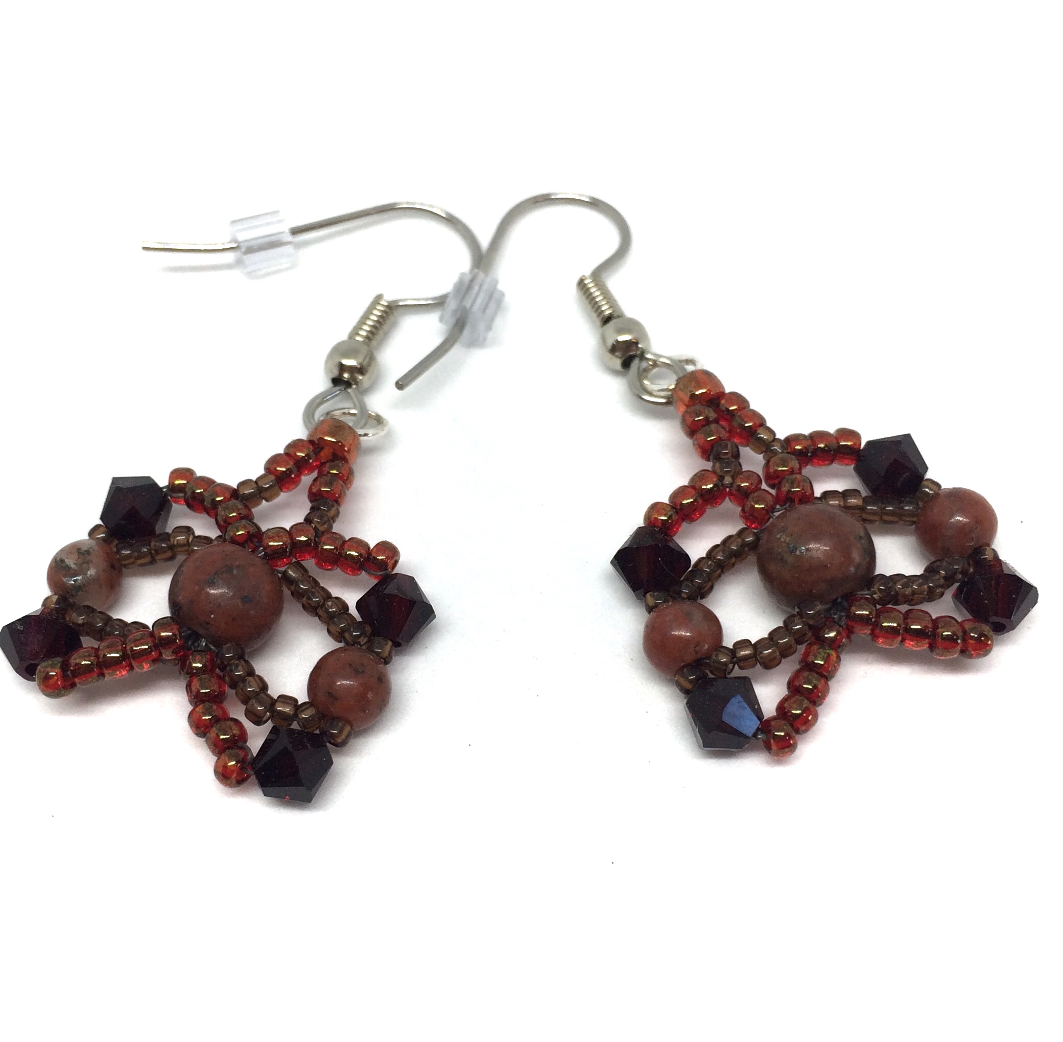 Inspired by the shape of the butterfly, I wove these earrings with a dark terracotta color Poppy Jasper with dark garnet red crystals and dark red and brown glass beads.