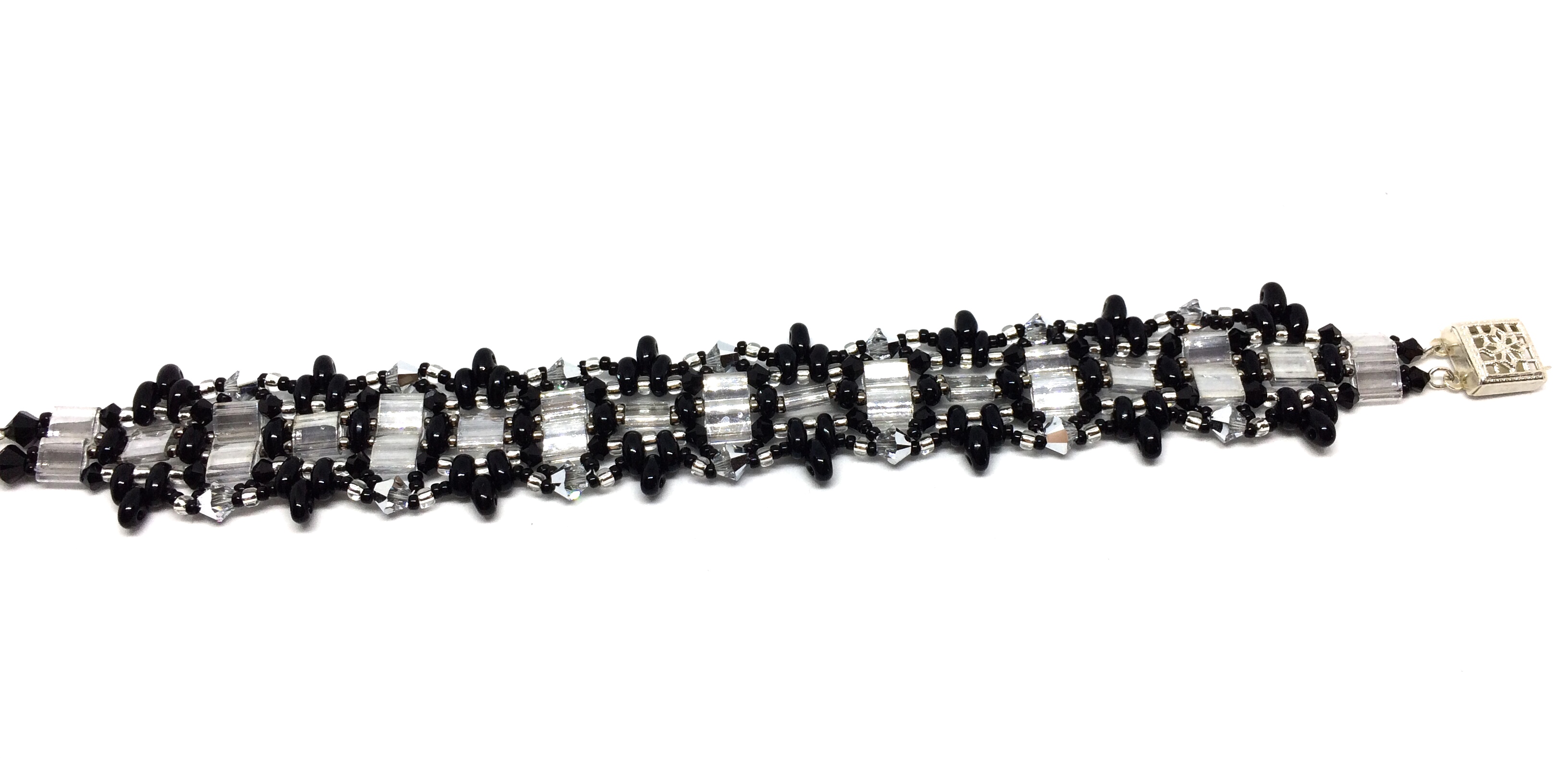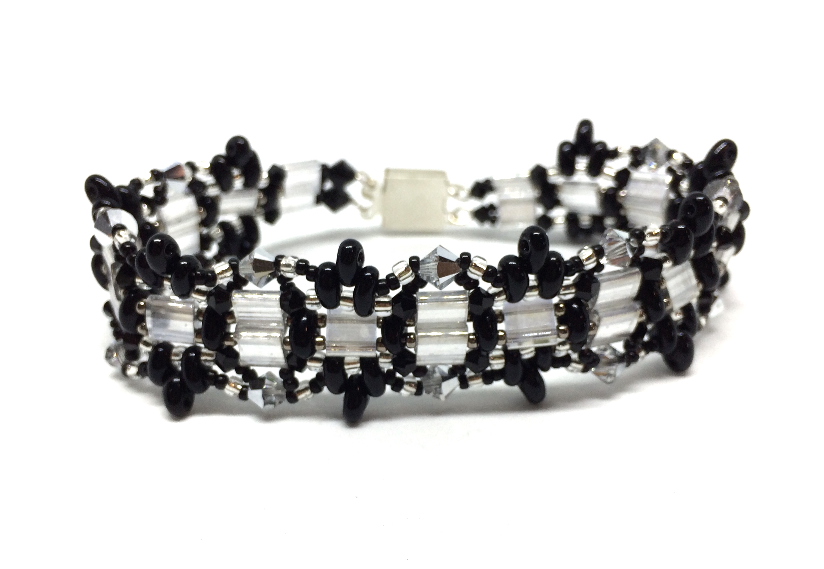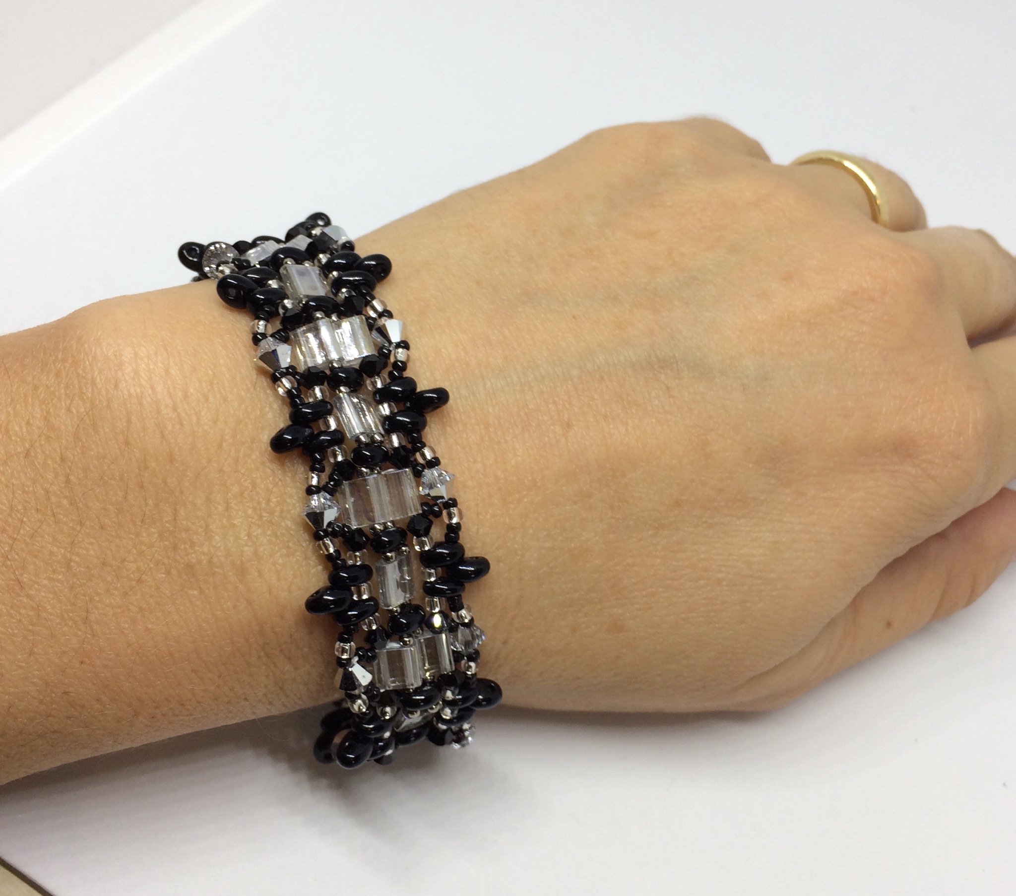 You can go from day to evening with this bracelet. This elegant black and silver bracelet is hand woven with glass beads and silver Swarovski crystals. The clasp is an easy to use snap style sterling silver box.