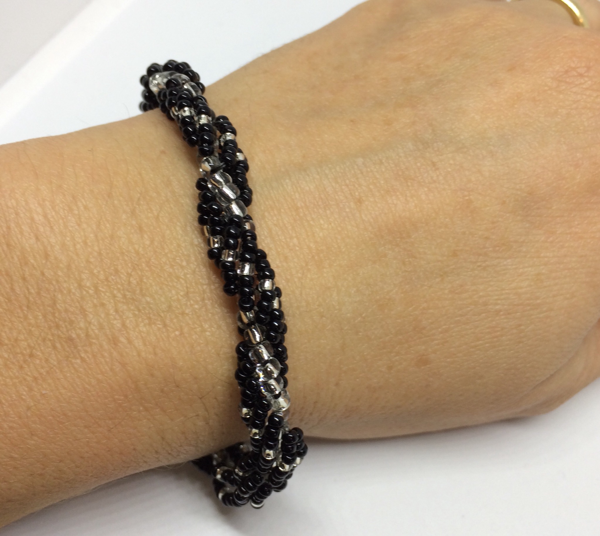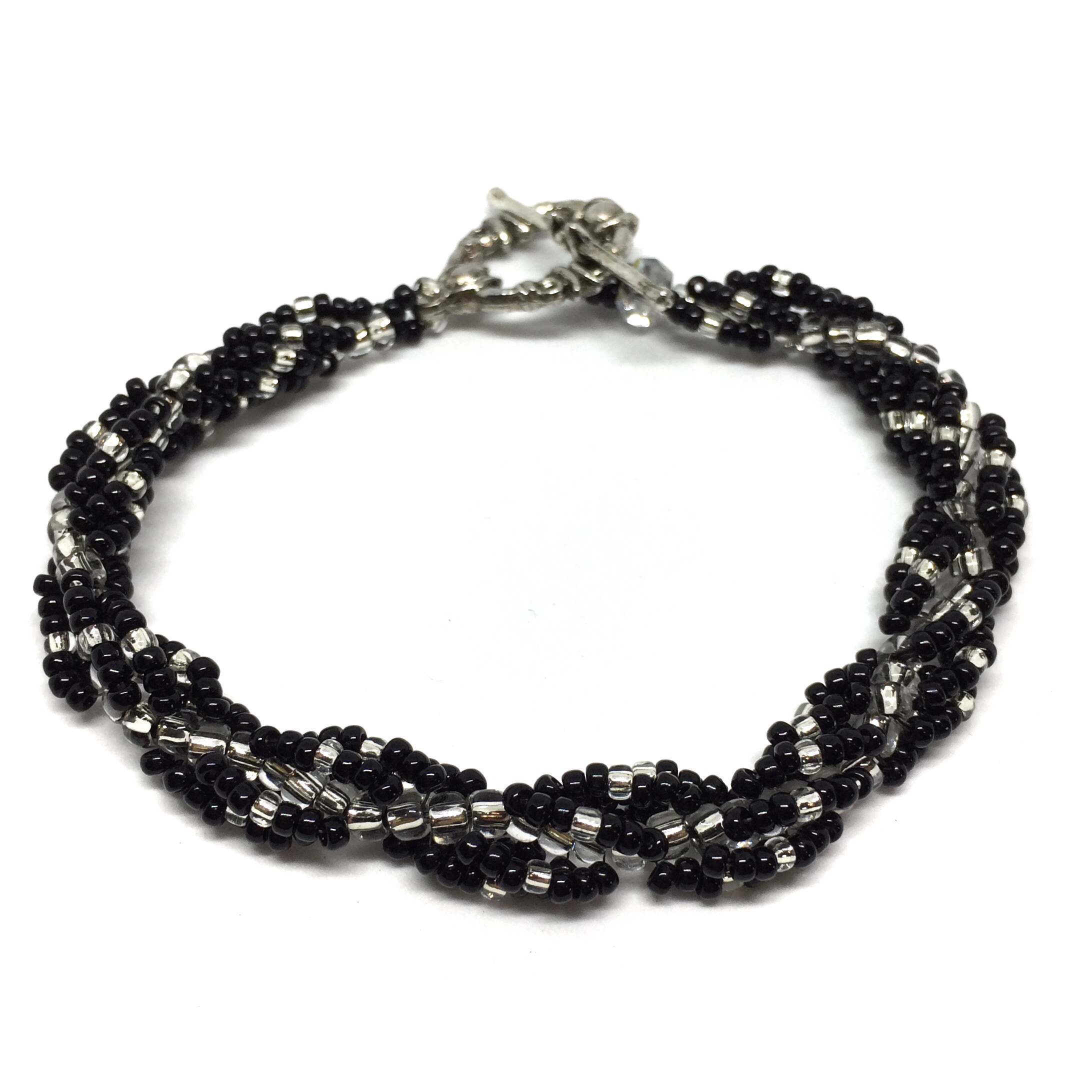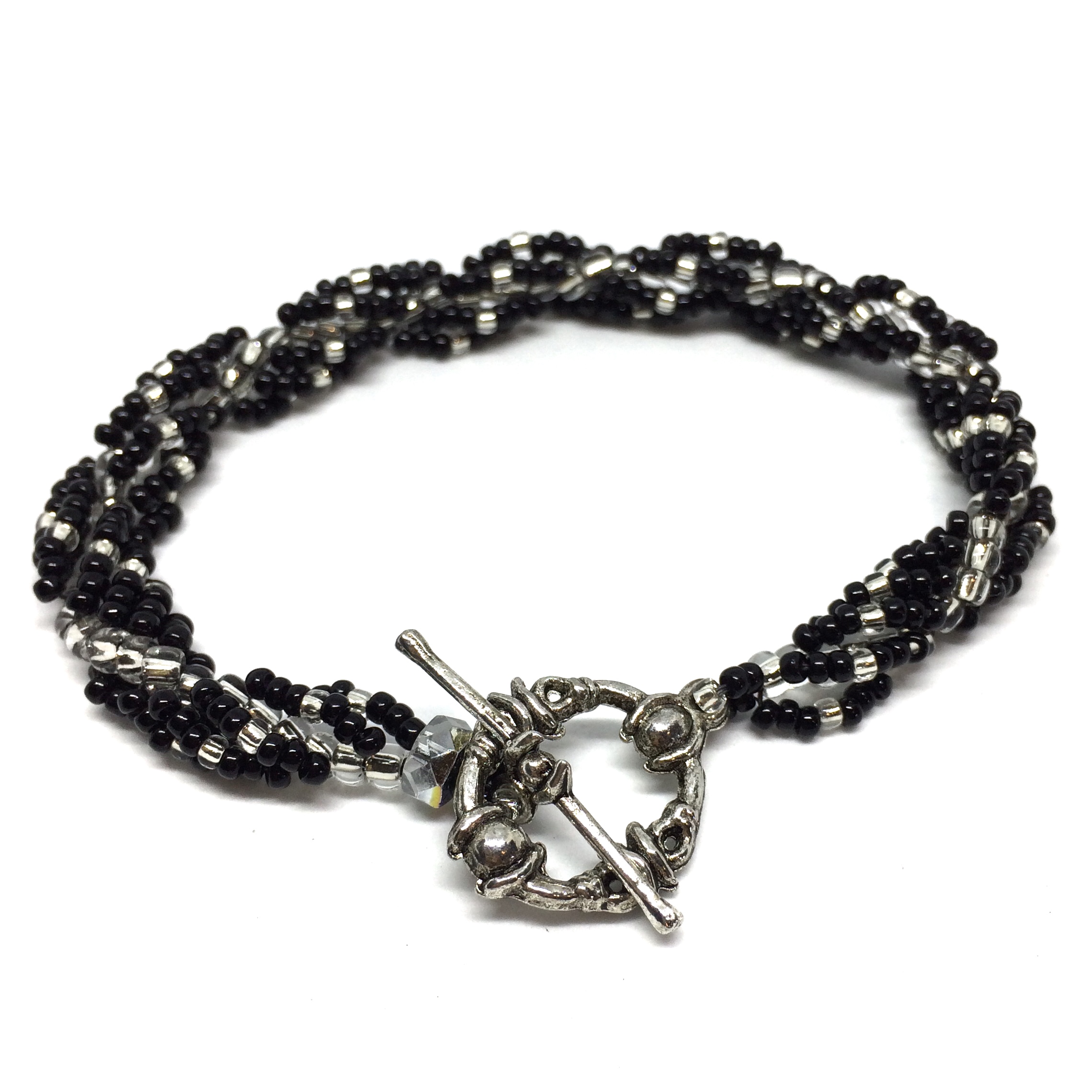 Black and silver make this the perfect everyday bracelet. Quality stitching makes sure this bracelet will last. I wove together hundreds of black and silver glass beads and chose an easy to use toggle clasp.