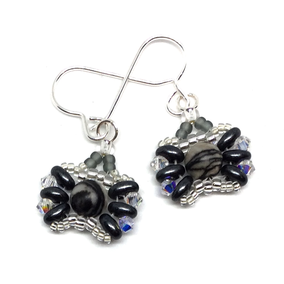 The Black Silk Stone gives the earrings an earthy look with ribbons of black swirled on a light gray background, while small crystals sparkle like diamonds along the edge. The Black Silk Stone and crystals are accented with steel gray beads and silver edging.