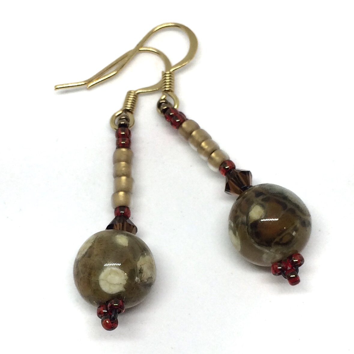 These earrings are all about the agate. The agate is a 10mm round natural stone with brown, mossy green, and light color spots. I have it dangles from a simple strand of gold color beads and a brown crystal.