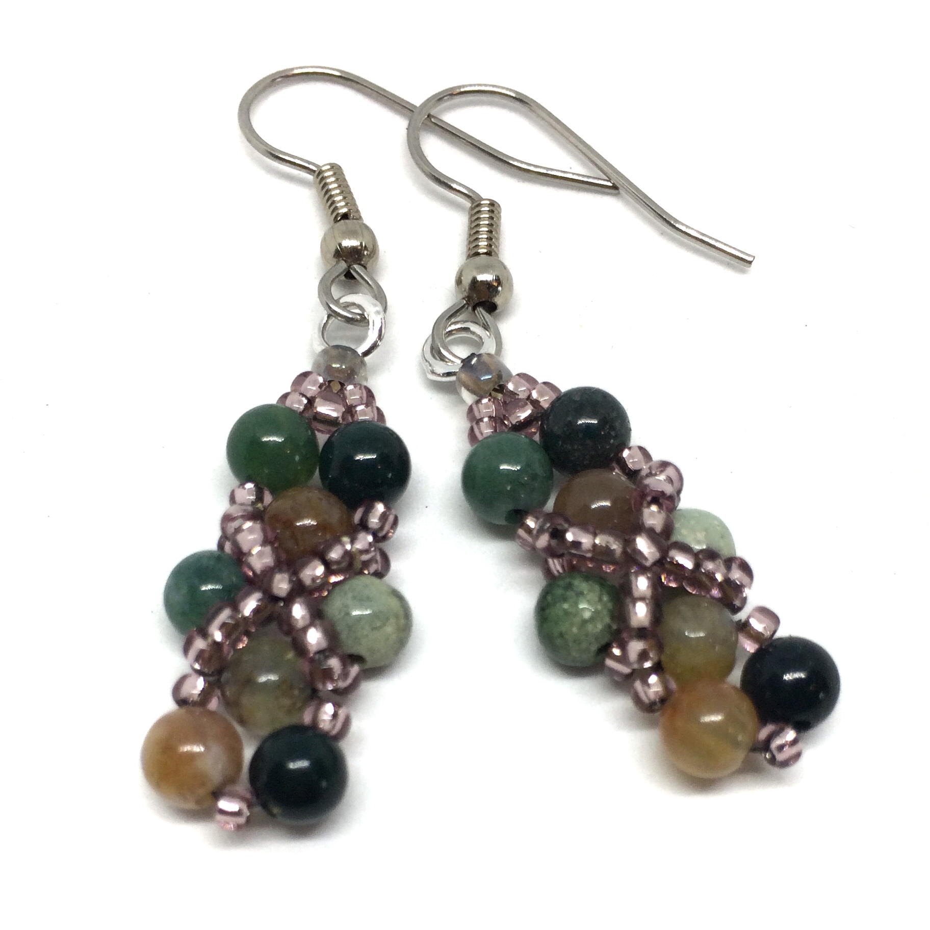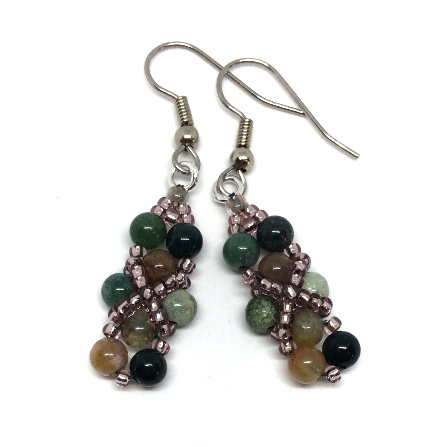These earrings are all about the jasper. I used 8 pieces of jasper in each earring so that all the colors are there. Colors include dark forest green, light green, mauve, and orange-tan. Beads are woven together with mauve color glass beads.