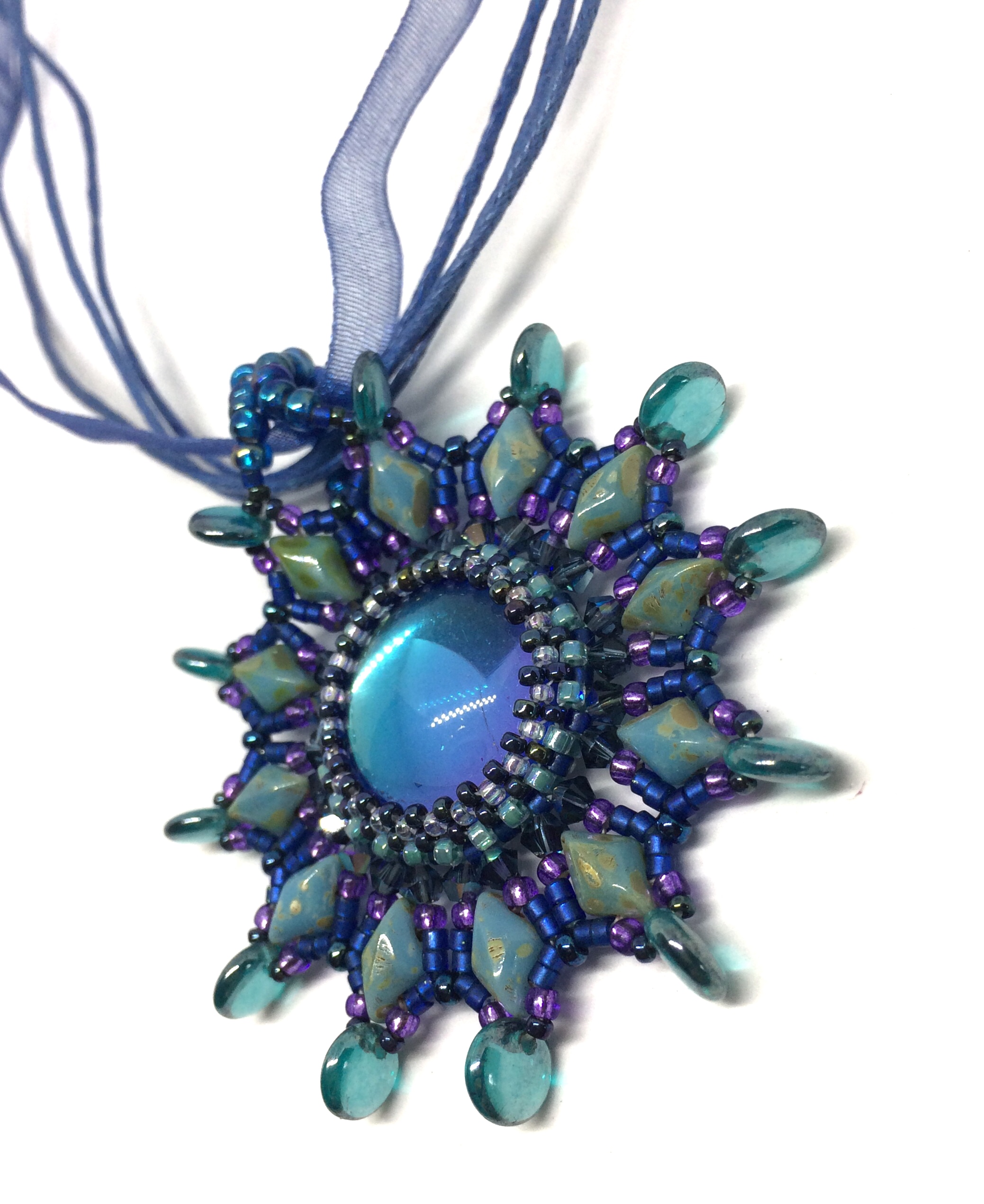 The pendant is a two inch diameter mandala style. The loop is made large enough to fit most wide hoops. Comes on a blue ribbon necklace which is adjustable from 17" to 18" long. Pattern is a Deborah Roberti.