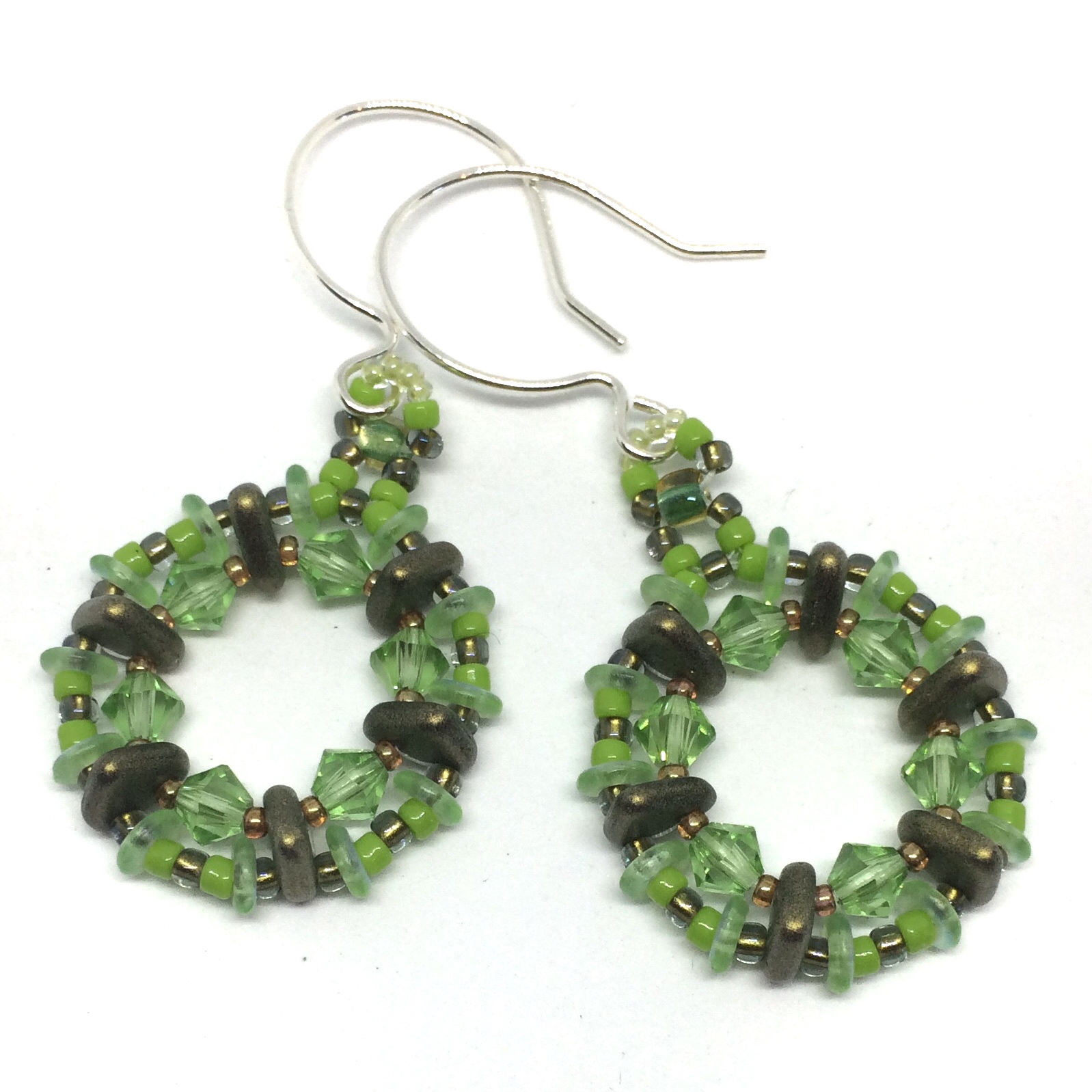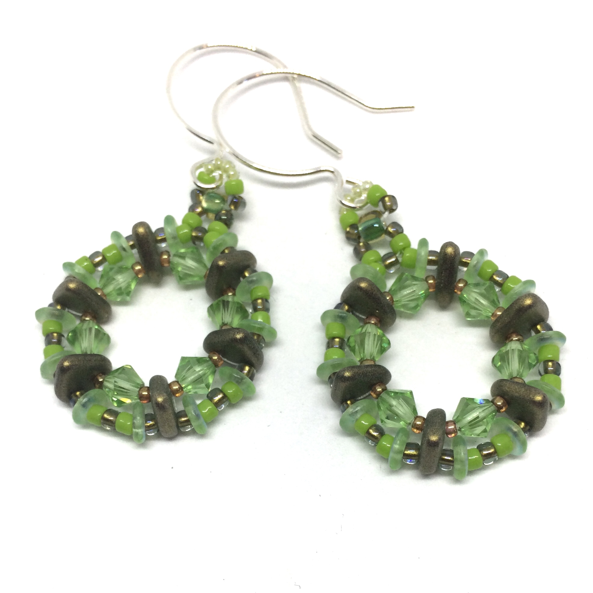 Lovely spring green is a favorite all year! Woven in a circle shape, I used Peridot color crystals with light green beads, and to create depth, I used bronze color triangles pointed forward.