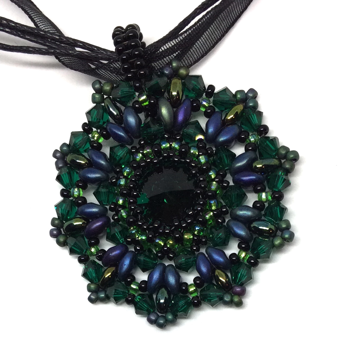 Emerald, the birthstone of May, carries the deep green color of nature and radiates a beautiful vivid tone. Imagine incorporating this sparkling green pendant into your wardrobe and showing off your green for all occasions. This pendant features an emerald green crystal center and more green crystals along the edging. It also has glass beads that are a slightly blue iridescent color.