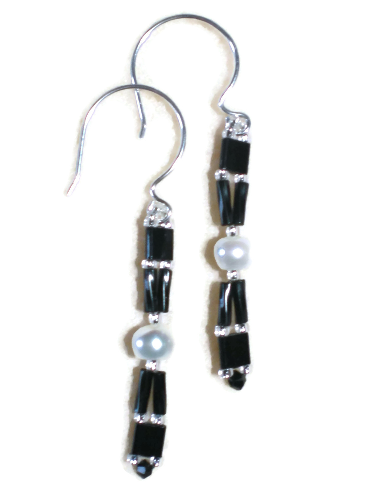 These hand woven earrings will be your next "go to" earrings. I wove black glass beads with a "grade B" cultured freshwater white pearls with little black Swarovski crystals adorning the bottom. The ear hooks are sterling silver.
